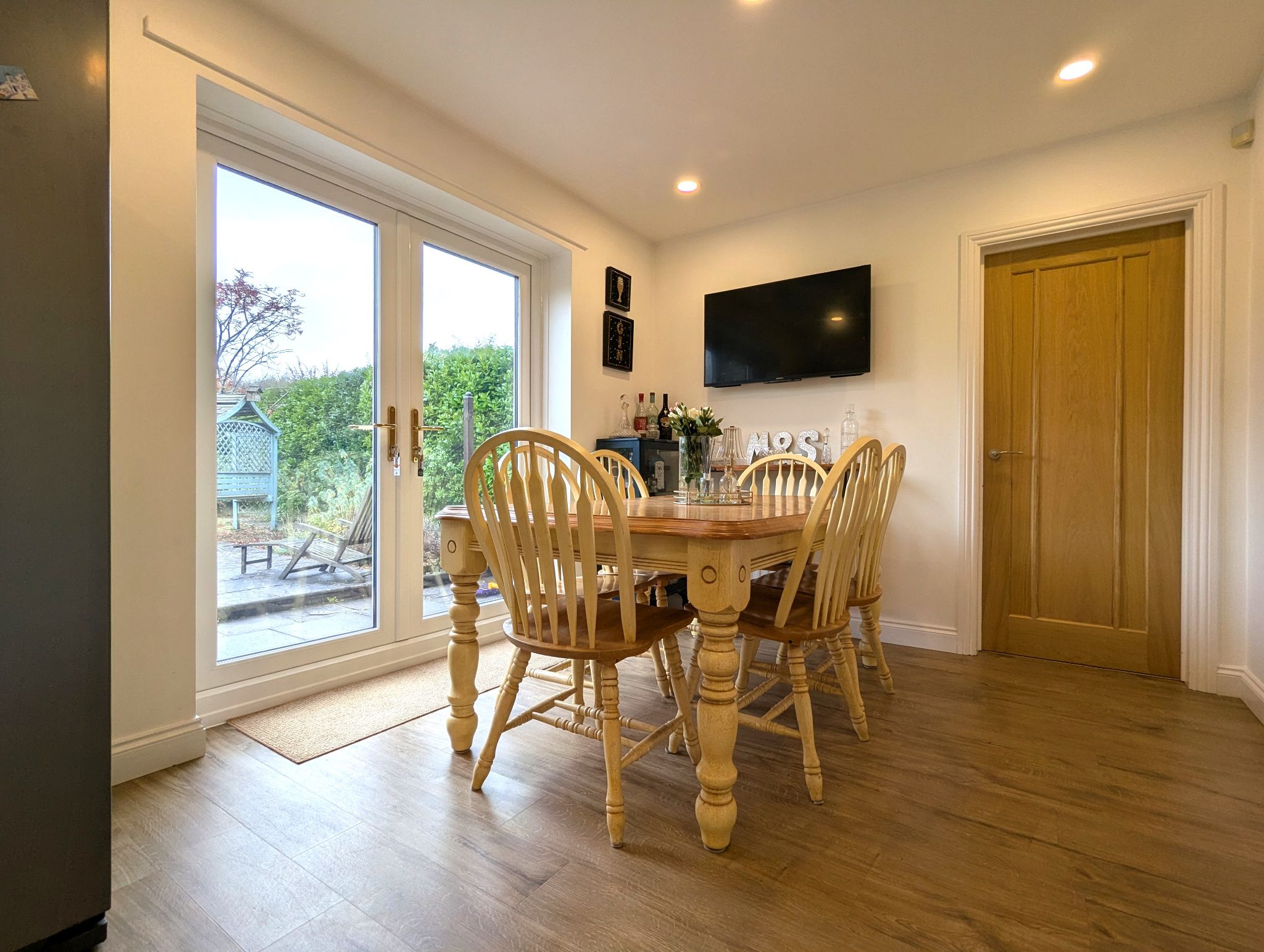 Kitchen/Breakfast Room - 9'1 x 22' (2.79m x 6.72m) - With Amtico LVT flooring throughout, this spacious kitchen with breakfast area offers an ample range of fitted base and wall units with work surfaces and tiled splashback. Integrated electric oven and hob with overhead extractor. Space for a dishwasher and American style fridge/freezer. Composite one-and-a-half sink with mixer tap below a rear-facing UPVC double glazed window. Double UPVC French doors looking out onto the rear garden. 2 wall mounted radiators and access to the rear of the garage.