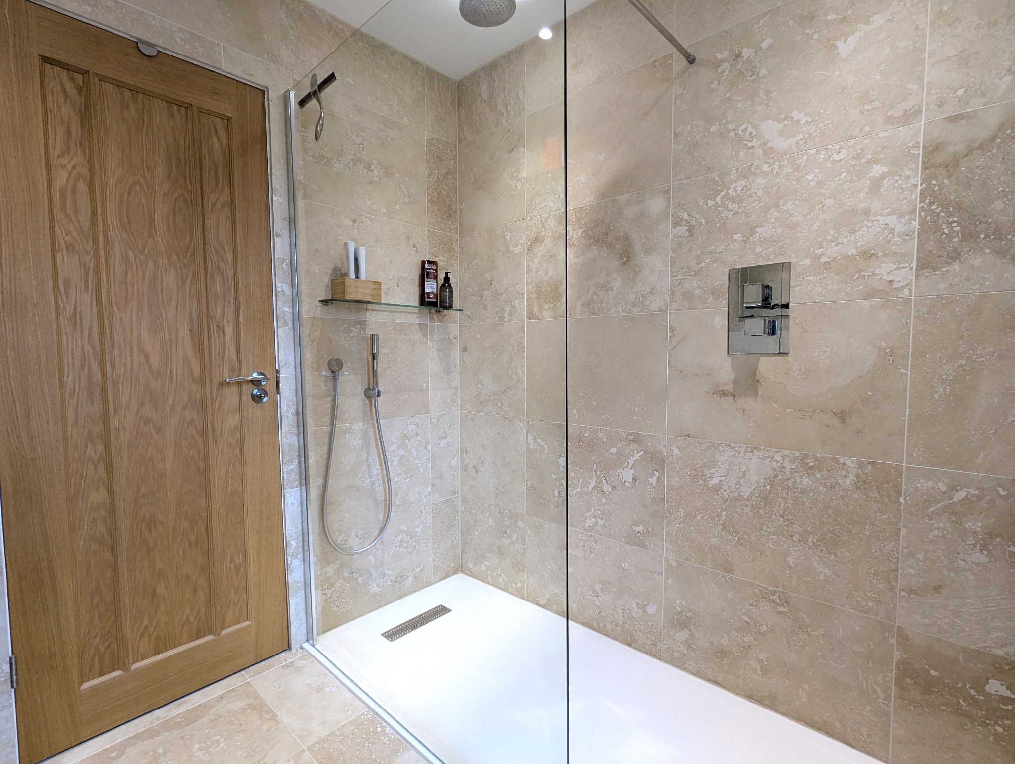 Ensuite - 6'7 x 6'5 (2.05m x 2.01m) - Travertine tiled flooring and full-height tiled splashback. Access to a toilet, vanity unit with fitted wash basin and walk-in shower unit with rainfall style mixer supplied shower and separate handheld shower unit. Rear-facing UPVC double glazed window, wall mounted heated towel rail and extractor fan.