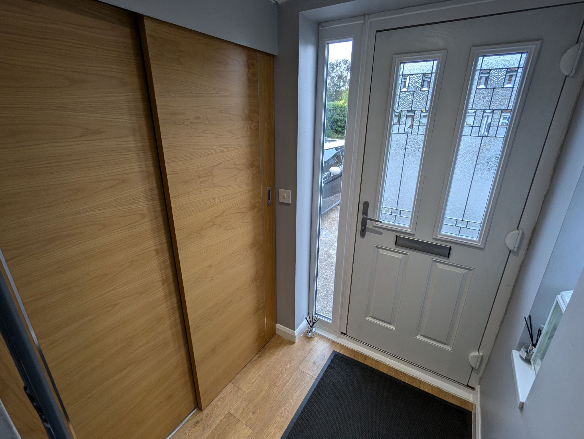 Enter via a composite front door into a large porch with laminate flooring, front and side-facing double glazed windows, built-in cloak room with sliding doors for coats and shoes. Wall mounted vertical radiator. UPVC door for access to the hallway.