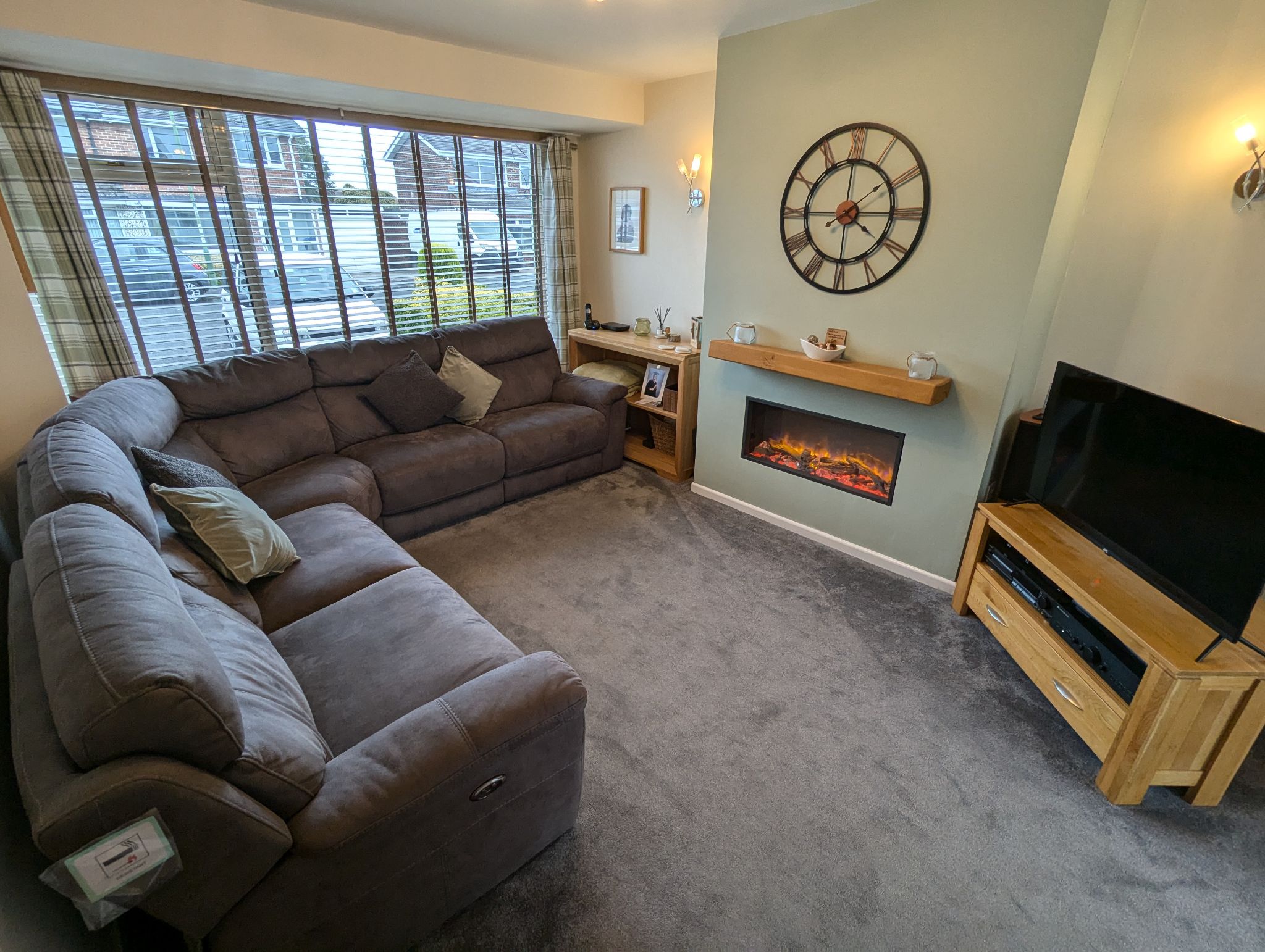 Carpeted lounge with a large front-facing double glazed window, wall mounted double panelled radiator and remote controlled electric fireplace. Open access to the kitchen/diner.