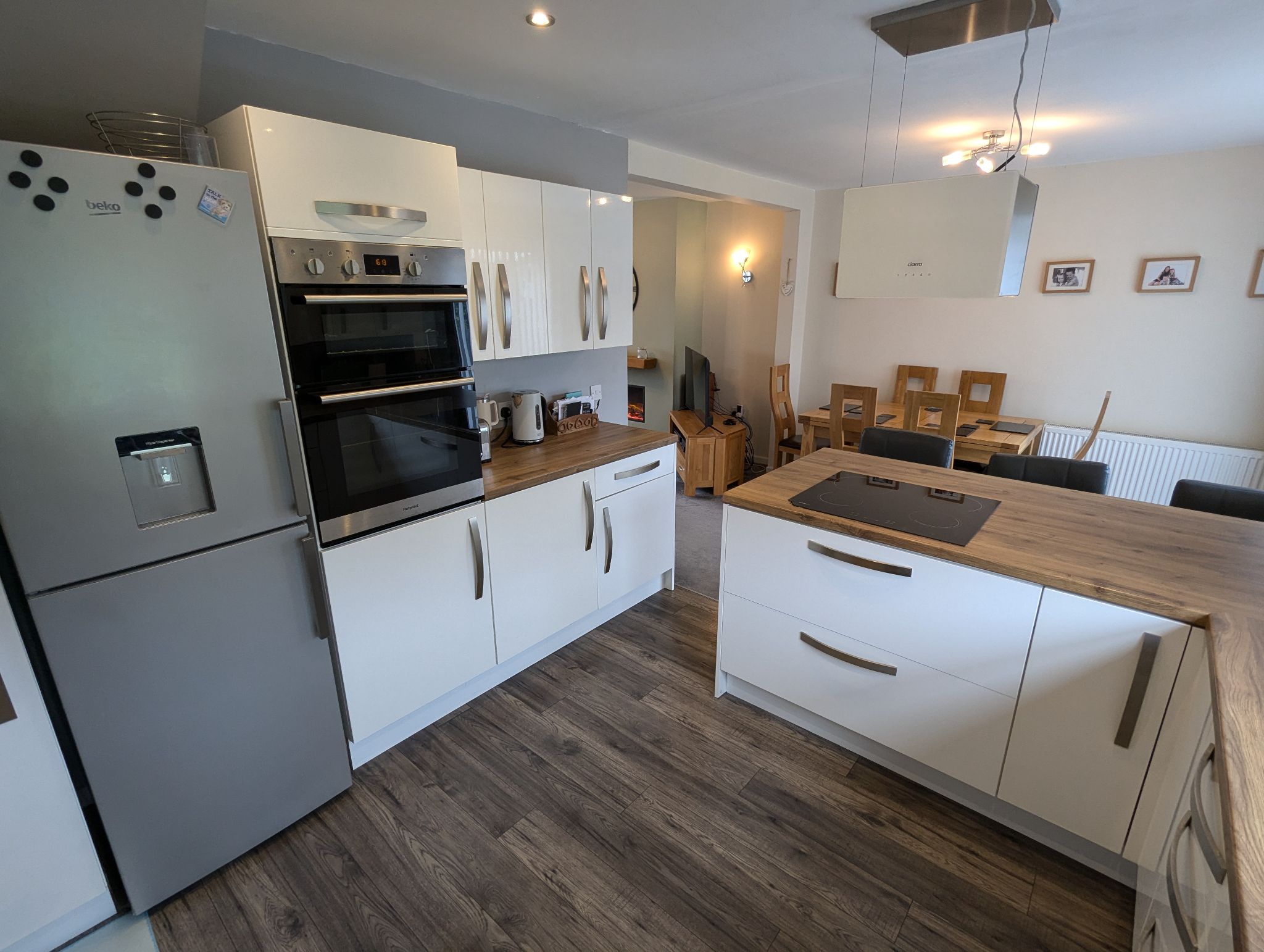 Go through to the dining area where the same carpeting as the lounge continues. Rear-facing sliding patio doors looking out onto the rear garden. Wall mounted single panelled radiator. Open access past the breakfast bar into a modern kitchen with a range of base and wall unit with white gloss panels and contrasting work surfaces. Integrated appliances include an electric twin oven and separate electric hob with overhead suspended extraction fan, dishwasher and fridge as well as space for a freestanding fridge/freezer. Composite mould one-and-a-half sink with mixer tap below a rear-facing double glazed window. Laminate flooring. Wall mounted vertical radiator. Access to the utility.
