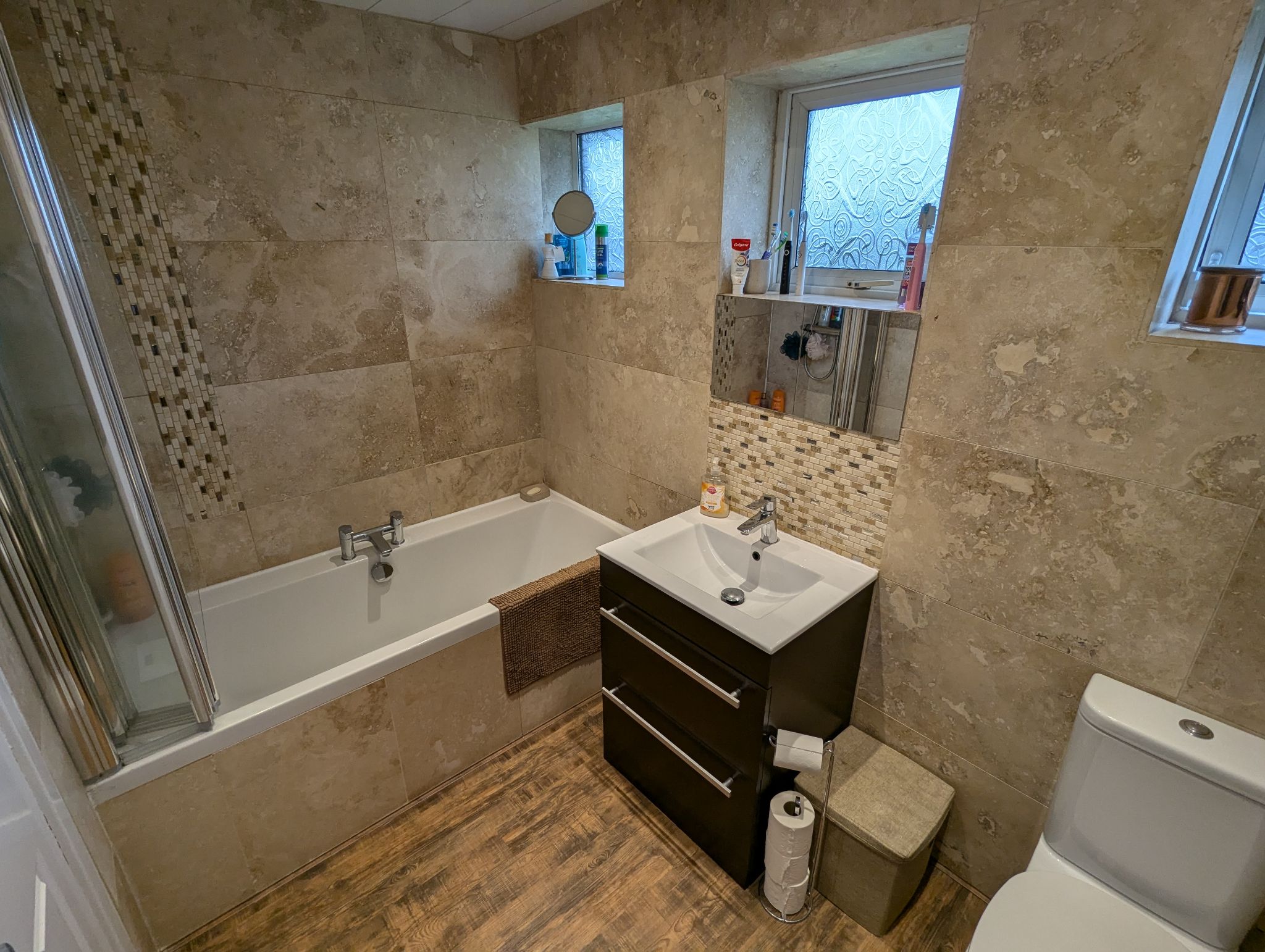Laminate flooring and full-height tiled splashback, access to a toilet, vanity unit with a fitted wash basin and bath with mains supplied shower over. 3 rear-facing double glazed windows. Wall mounted heated towel rail.