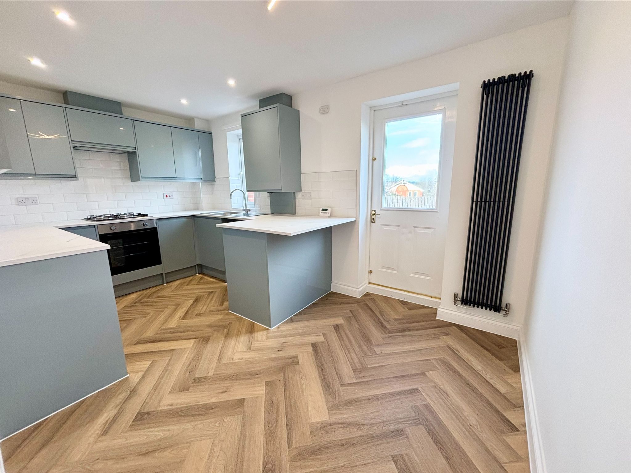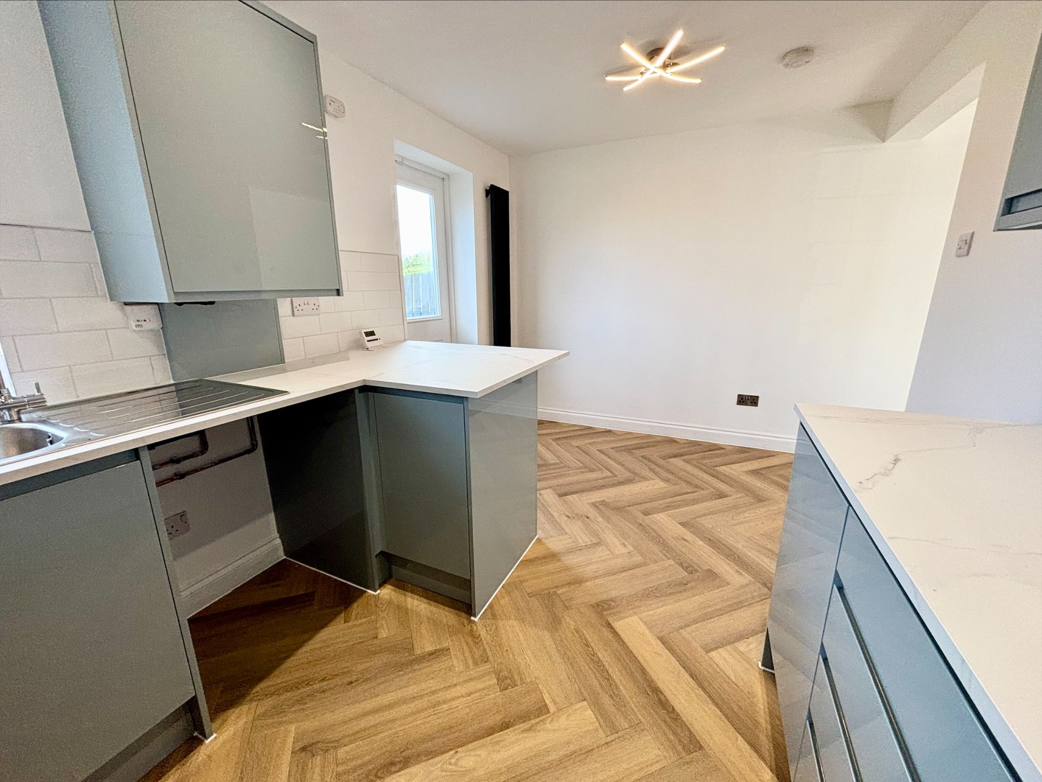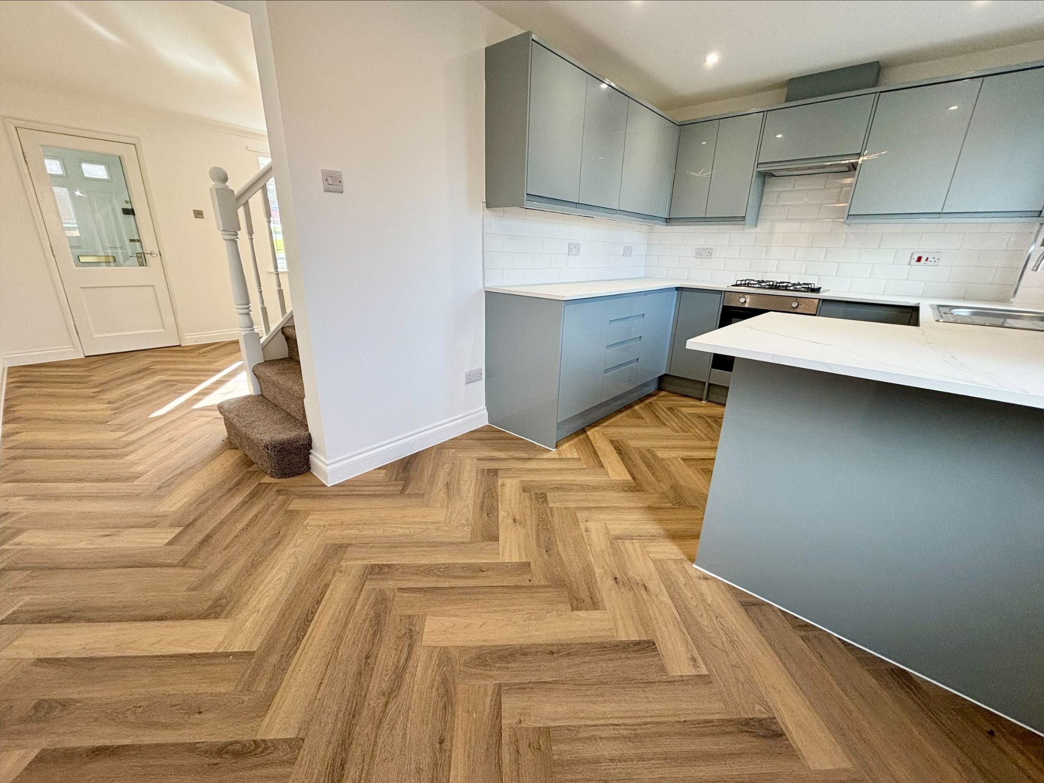Kitchen / Diner - 4.372m x 2.639m - Herringbone laminate flooring, door to rear garden, electric integrated oven & gas hob, extractor hood, space for fridge-freezer, space for washing machine, combi boiler, vertical radiator.