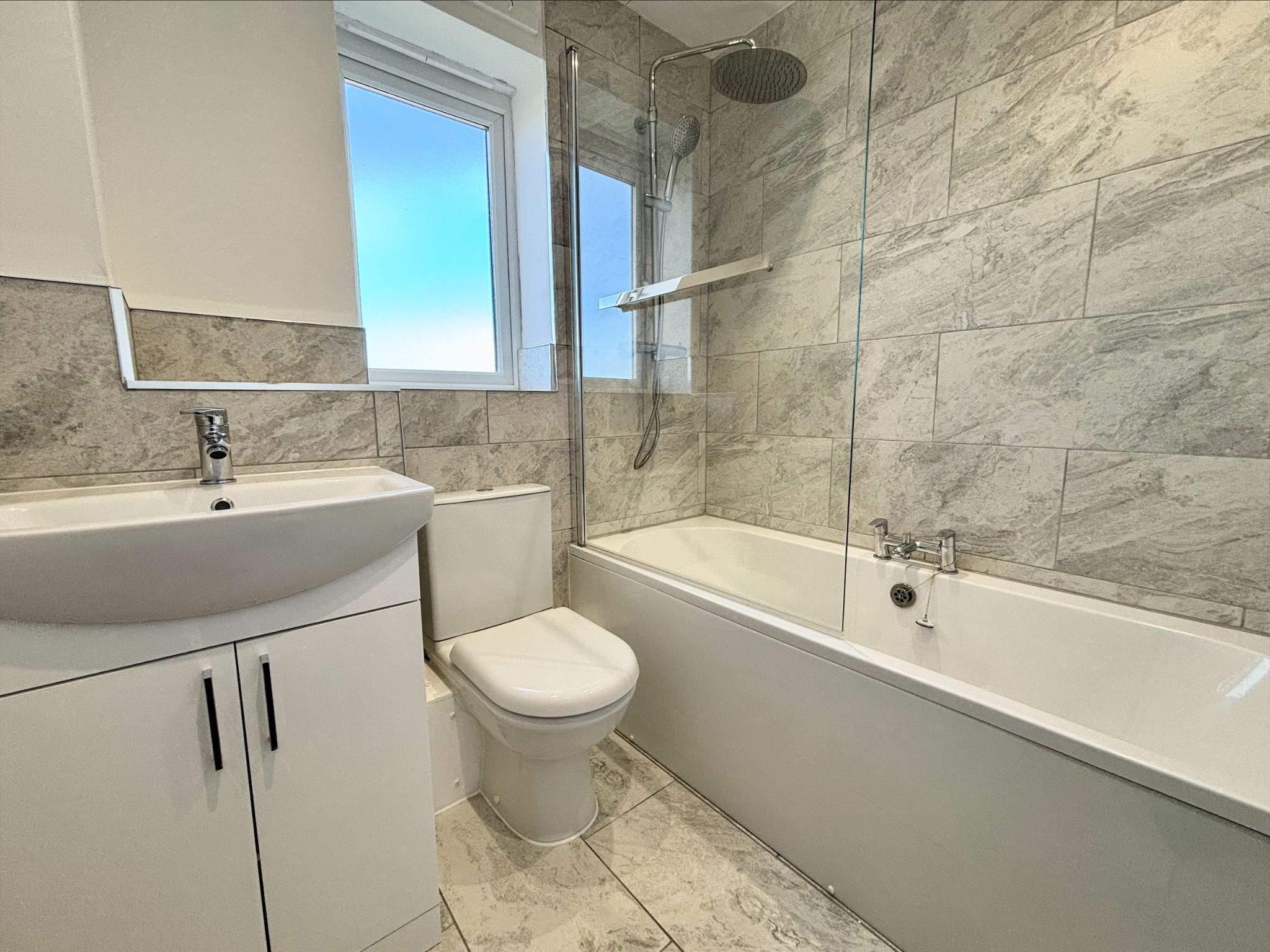 Family Bathroom - Window to rear, tiled flooring, bath & shower powered from mains, heated towel rail, hand basin & vanity unit & spotlights.