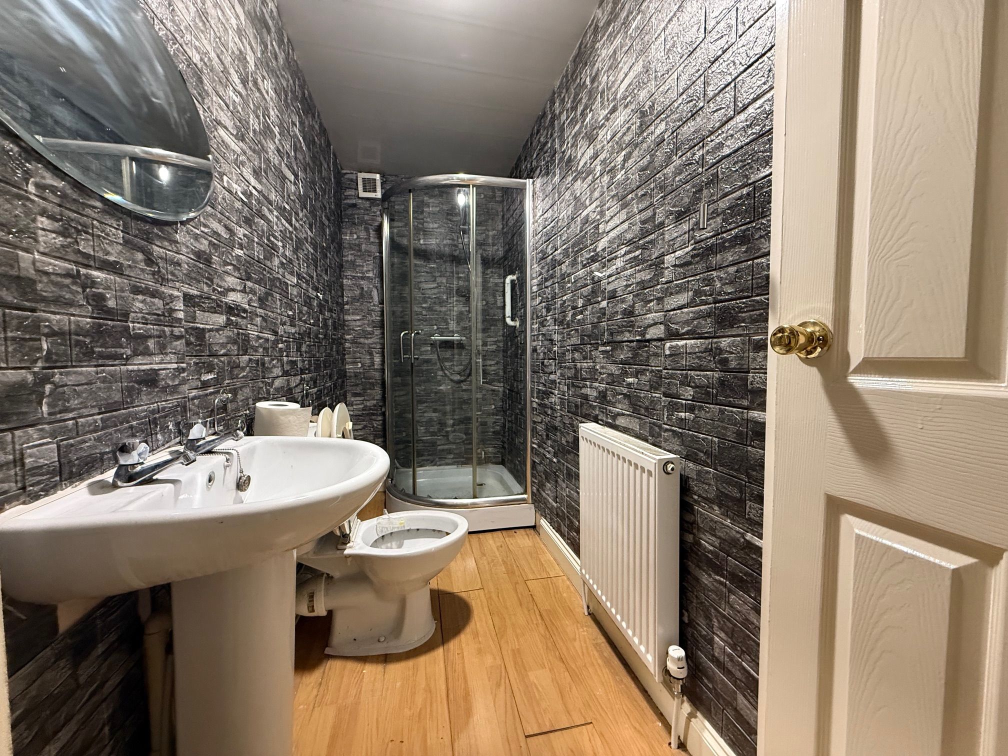 En-suite. With WC, hand basin and shower enclosure, laminate floor and storage cupboard.