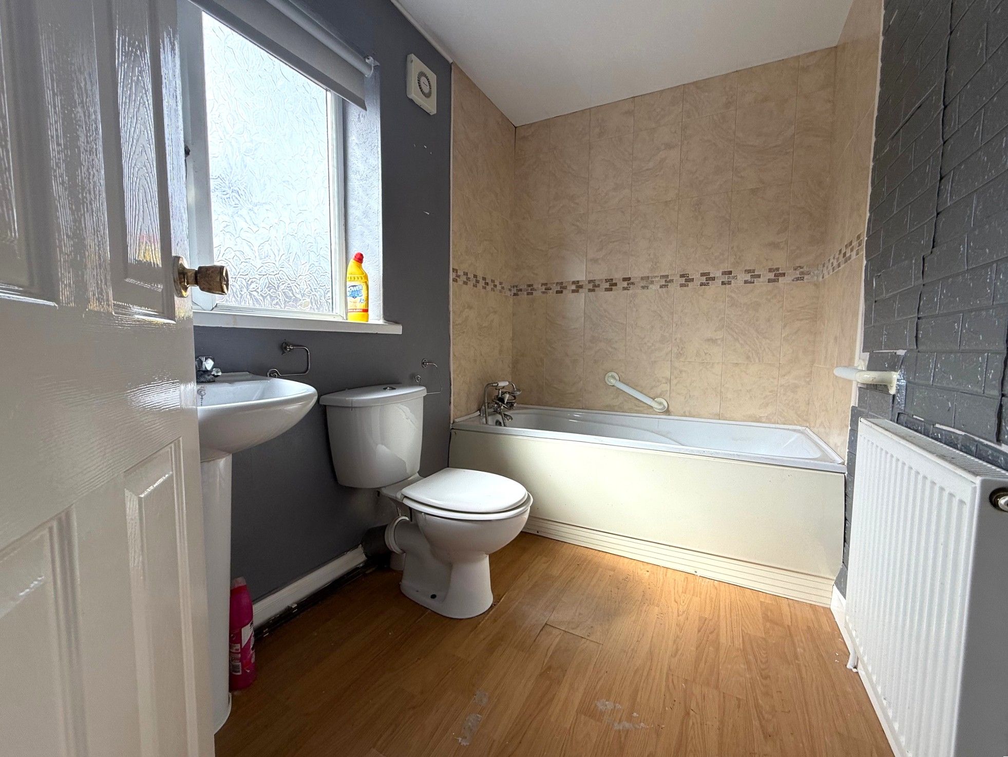 Bathroom. 8'5 x 5'6 (2.56m x 1.69) Double glazed window, bath with shower tap and shower attachment, WC, hand basin, part tiled walls, radiator and laminate flooring.
