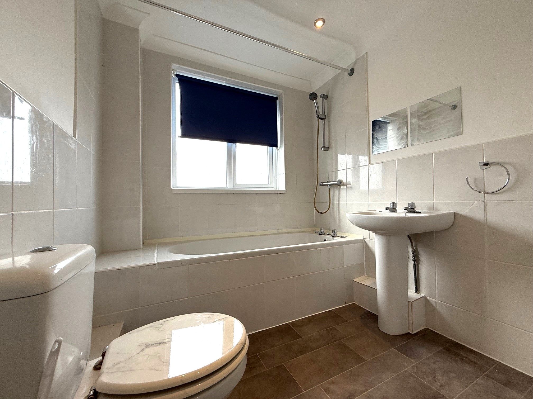 Bathroom - 6'6 x 8'9 (2.03m x 2.72m) - featuring double glazed UPVC window to rear, WC, hand basin, bath with overhead shower powered by mains, half height tiles, heated towel rail, spotlight light fittings & vinyl flooring.
