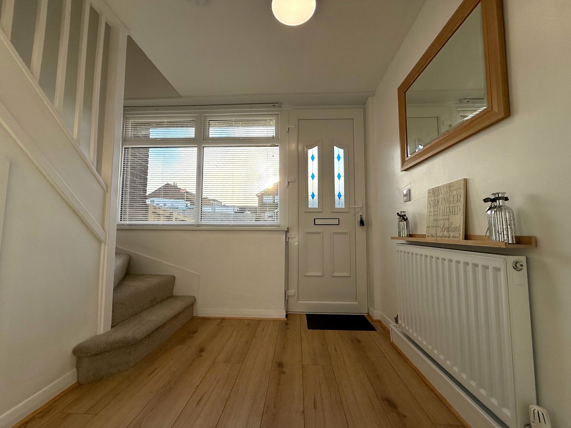 Entrance Porch. Accessed via a new double glazed Upvc door, radiator, new double glazed window to front, laminate flooring, hardwired smoke alarm, storage cupboard with meters and stairs to the upper floor.
