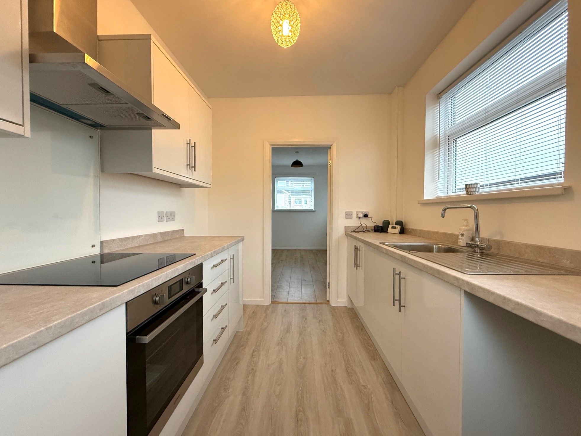 Kitchen. 10'8 x 7'8 (3.26m x 2.35m) Double glazed window to side, Upvc double glazed door to rear, range of modern wall and base units, integrated induction hob, electric oven, extractor fan, space for fridge freezer, plumbed for washing machine, stainless steel sink and drainer, wall mounted Baxi combination boiler.