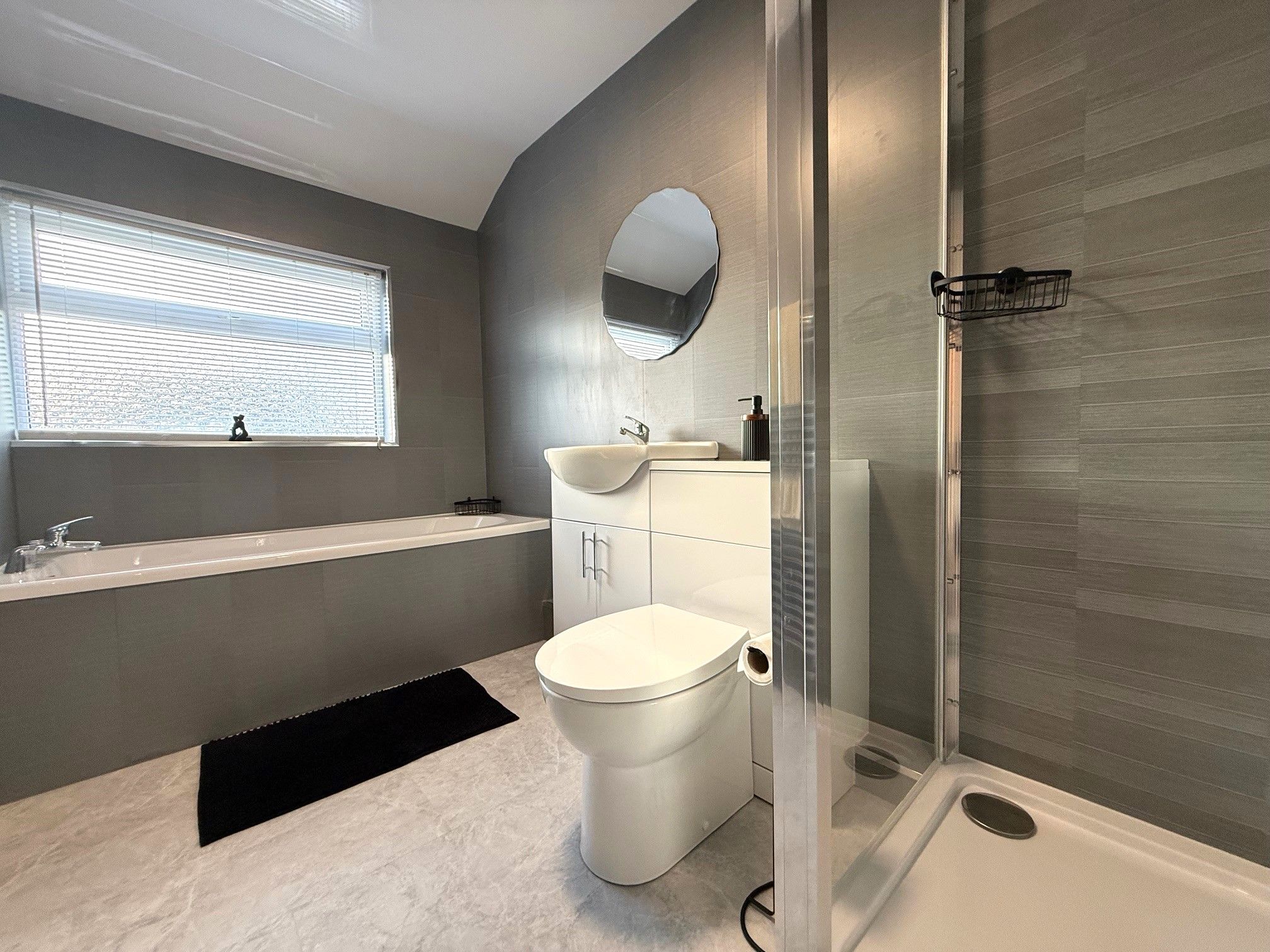 Bathroom. 10'11 x 5'4 (3.32m x 1.63m) Double glazed window to front, bath, walk in shower enclosure with mains twin head shower, vanity sink unit, heated towel rail, decorative cladding to walls and ceiling.