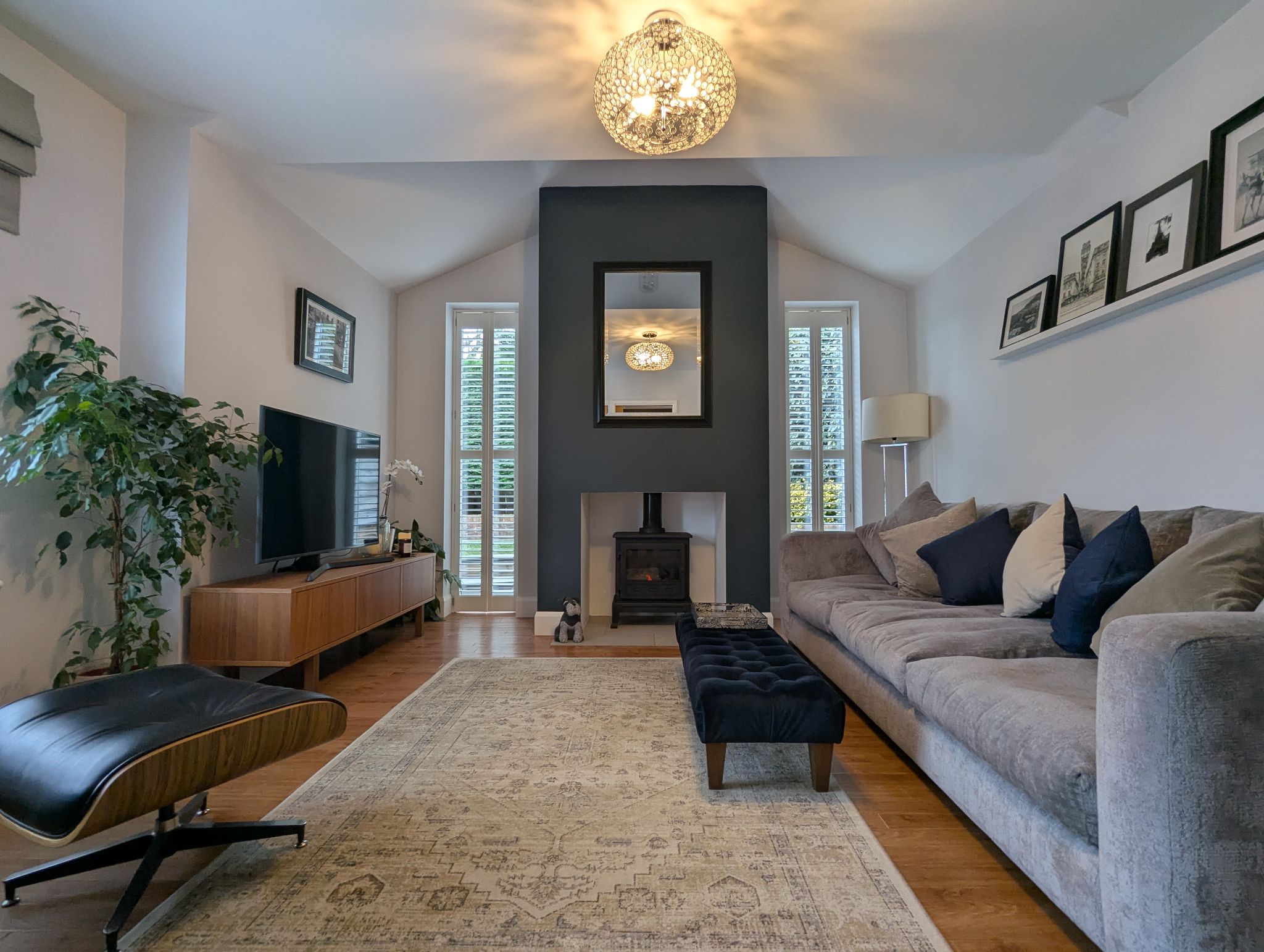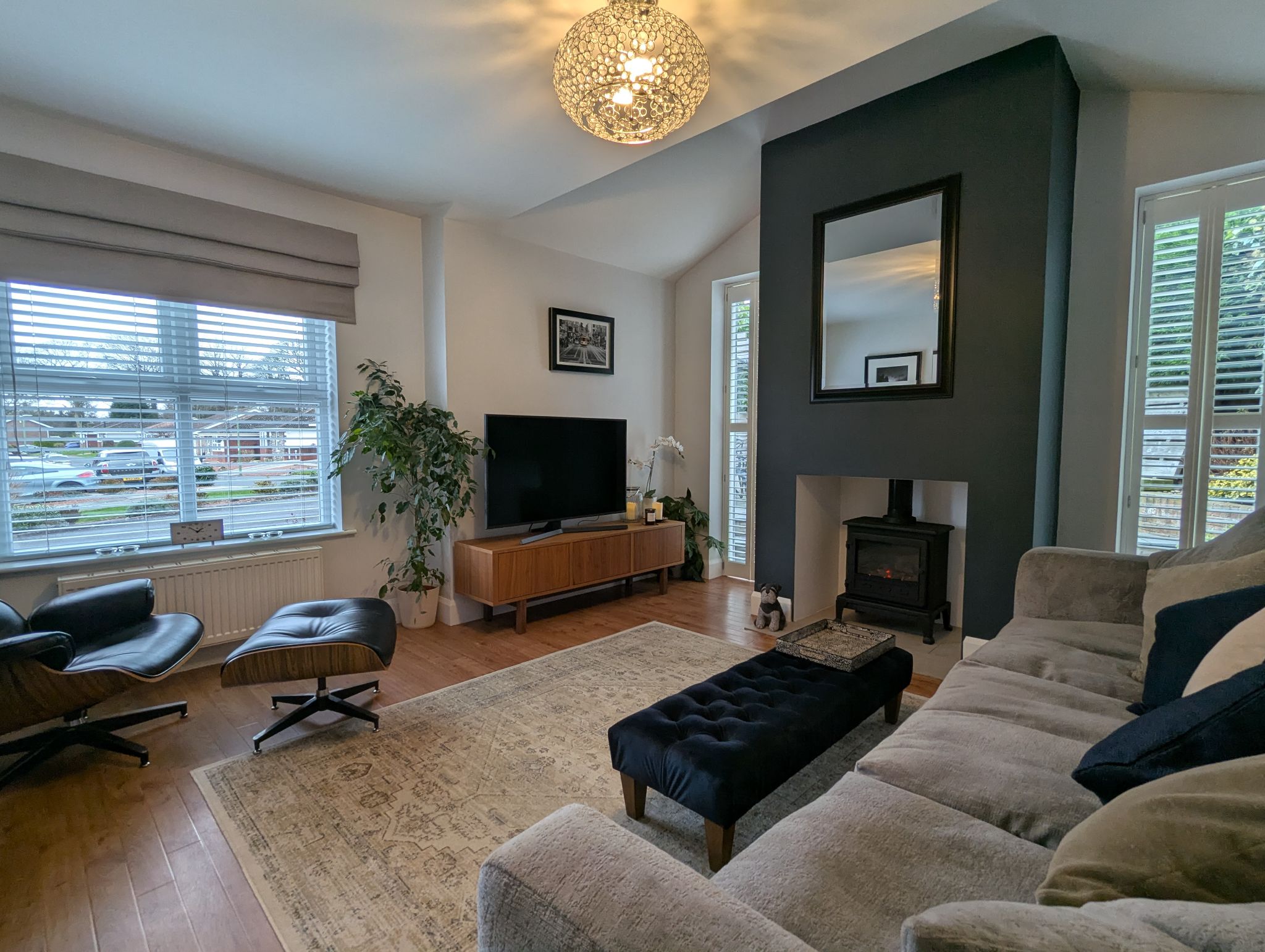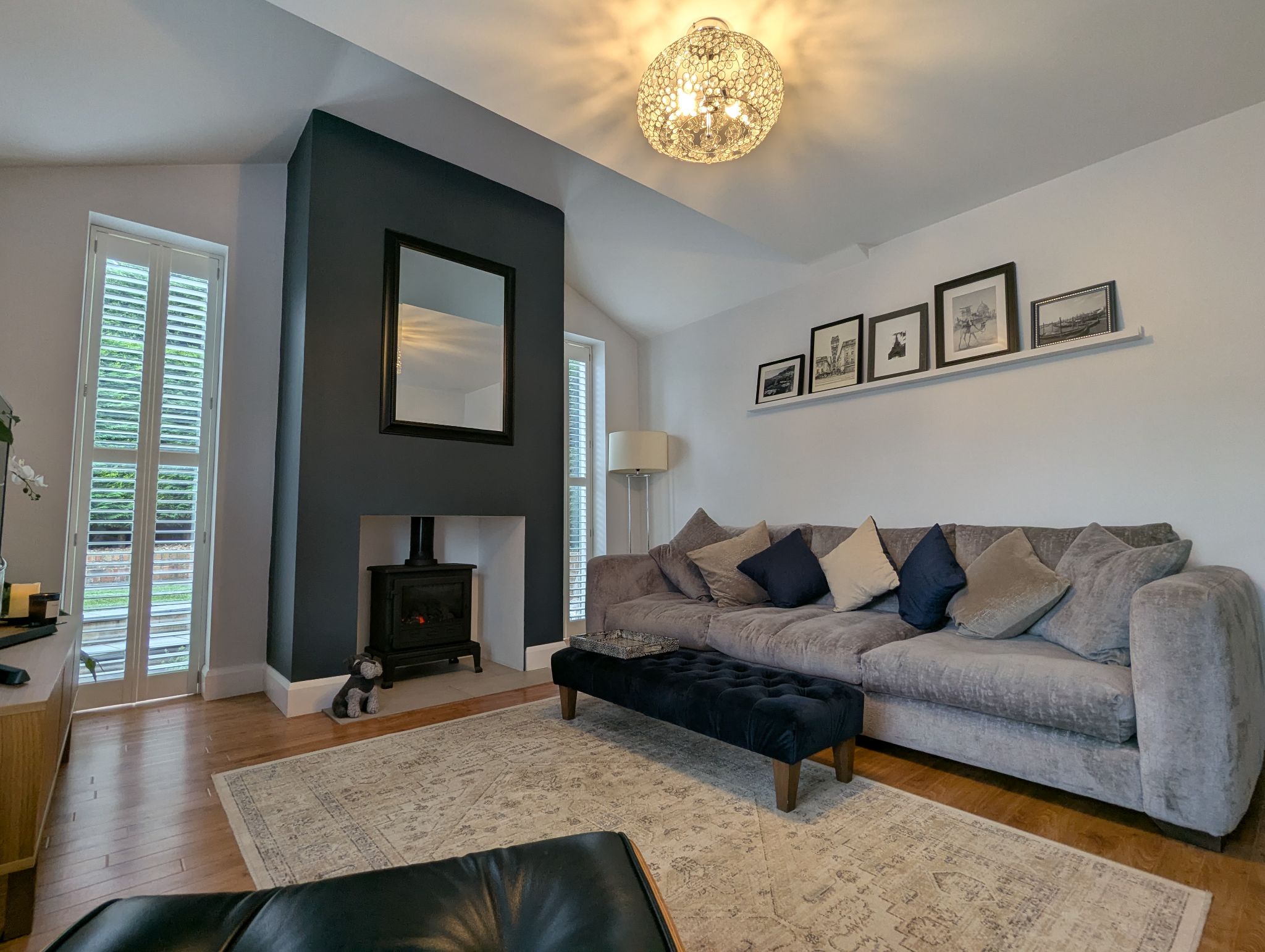 Lounge - 12'9 x 12'1 (3.93m x 3.68m) - What was formerly the garage has been converted into a stunning extended lounge with a stove style gas fire place as the room's centrepiece. Along with a front-facing UPVC double glazed window are 2 further side-facing, floor-to-ceiling UPVC double glazed windows with white shutters in the extension to either side of the fire place and wall mounted radiator.