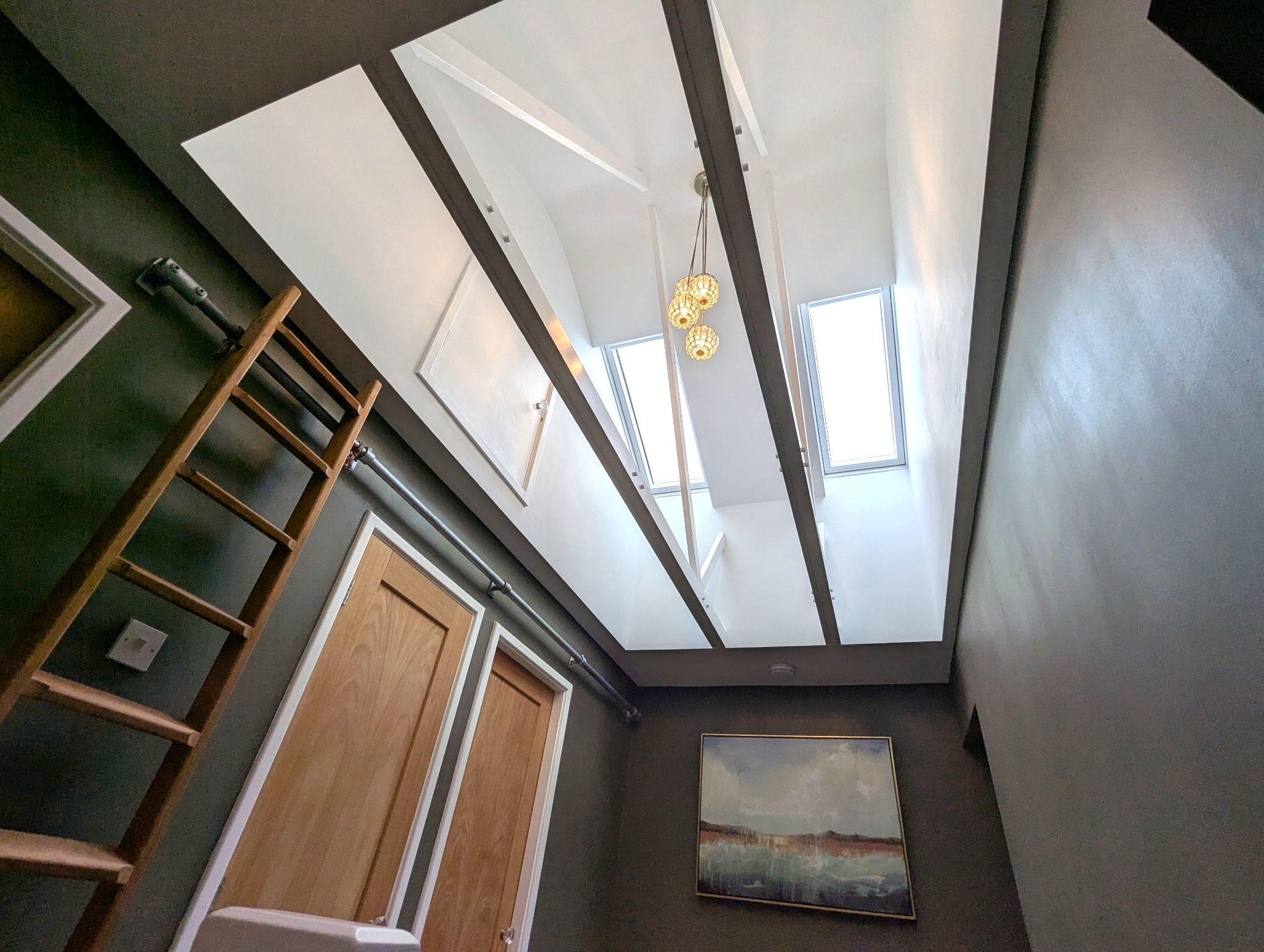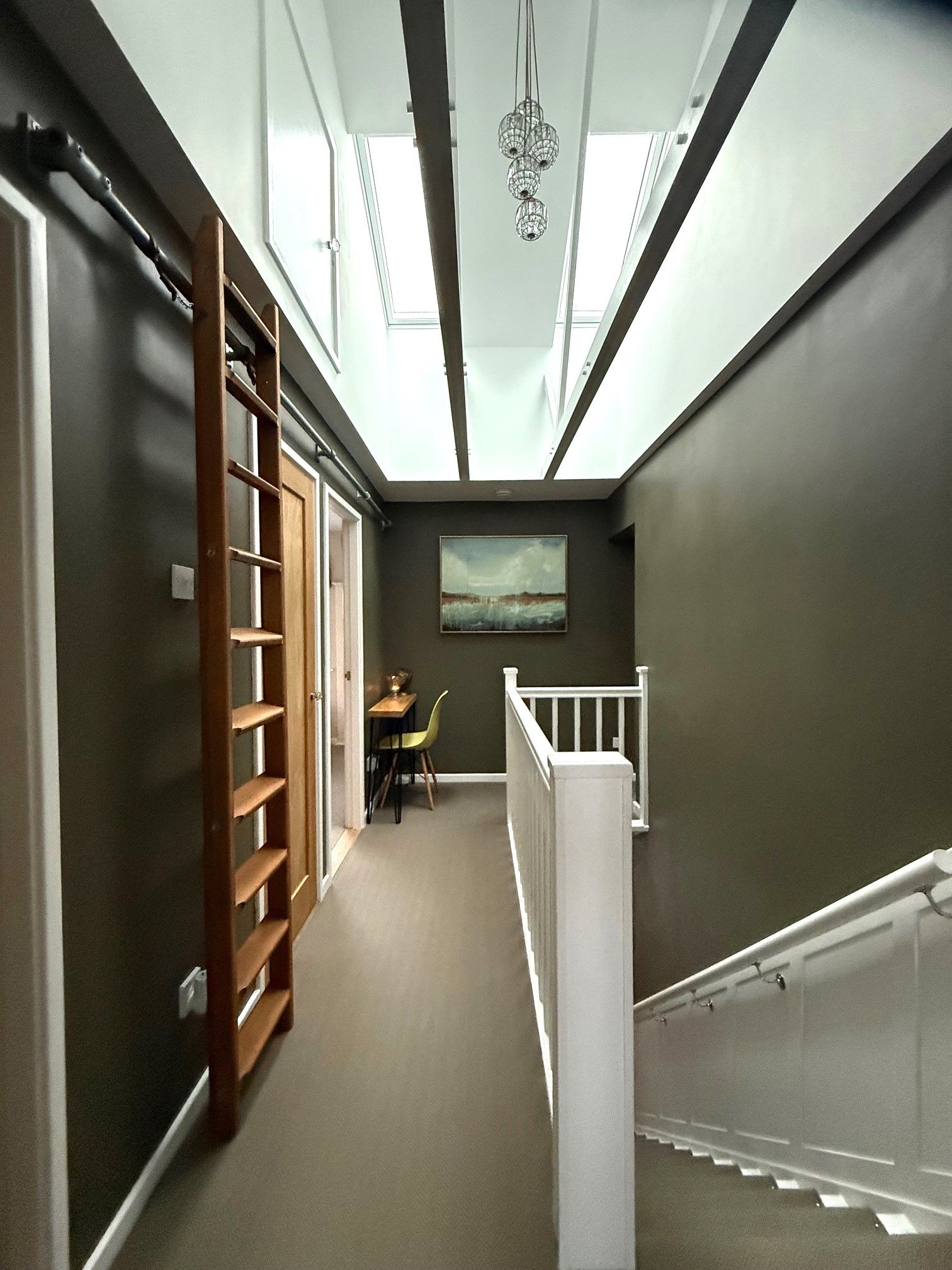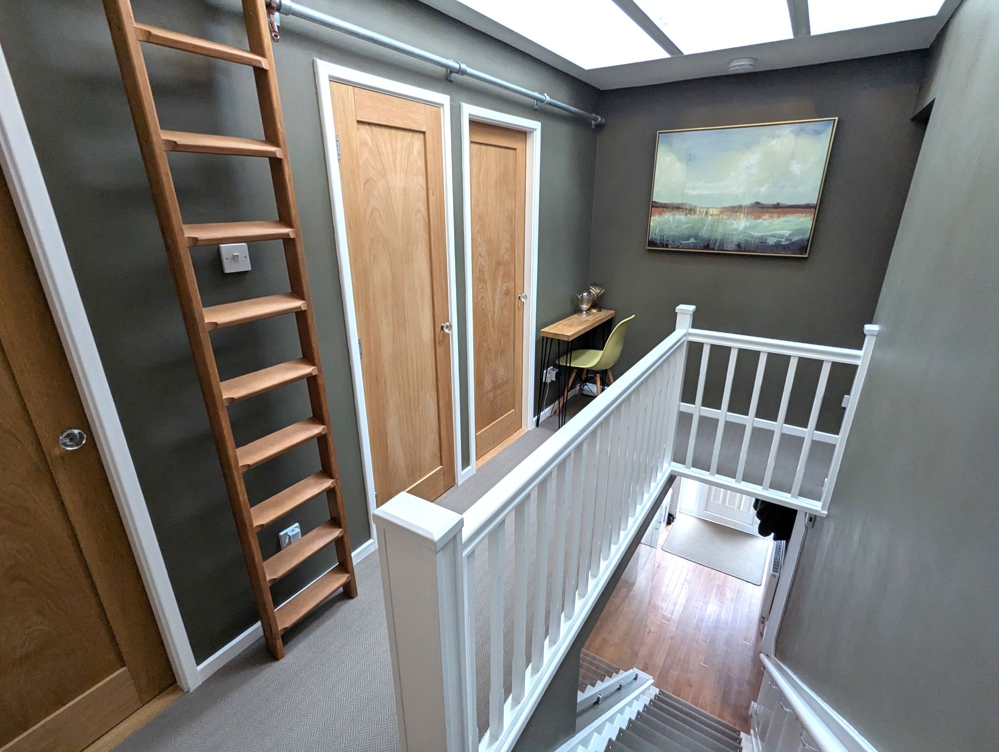 First Floor Landing - Ascend the carpeted staircase to arrive at a landing with a stunning and unique feature. The landing has been redesigned to feature vaulted ceilings with exposed rafters and 2 large Velux skylights which allow ample natural light to flow through the entire space. Another unique feature is the loft access via an upper doorway above a built-in cupboard, accessible via a permanent but moveable solid wood ladder on a metallic rail. The landing offers access to four well-proportioned double bedrooms and a sublime family bathroom via a sliding internal door.