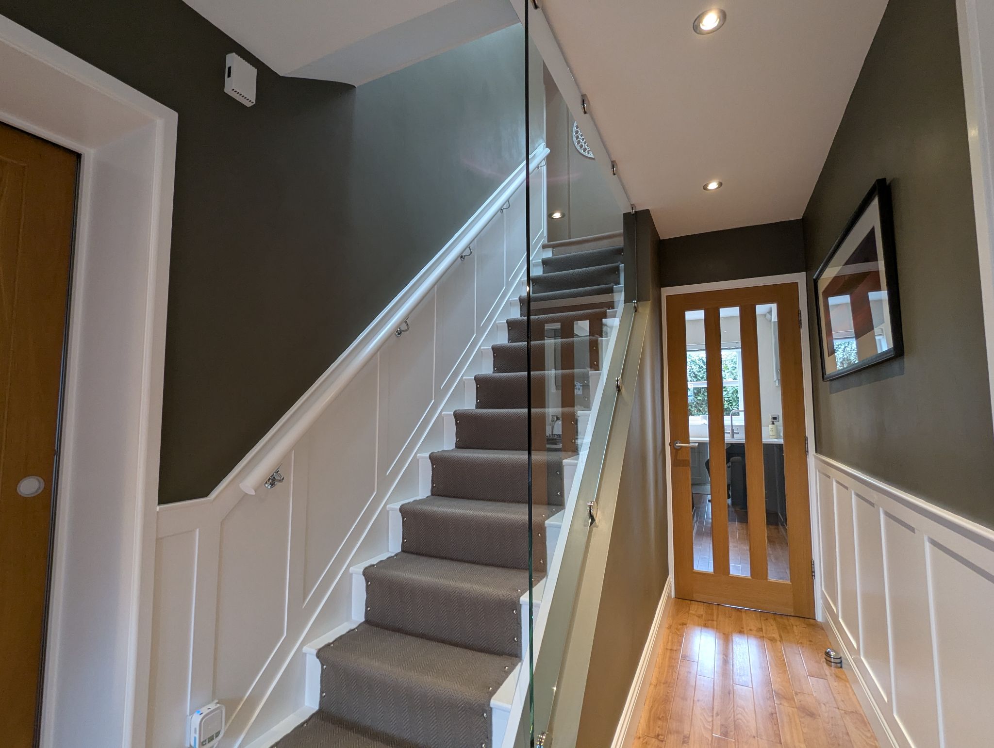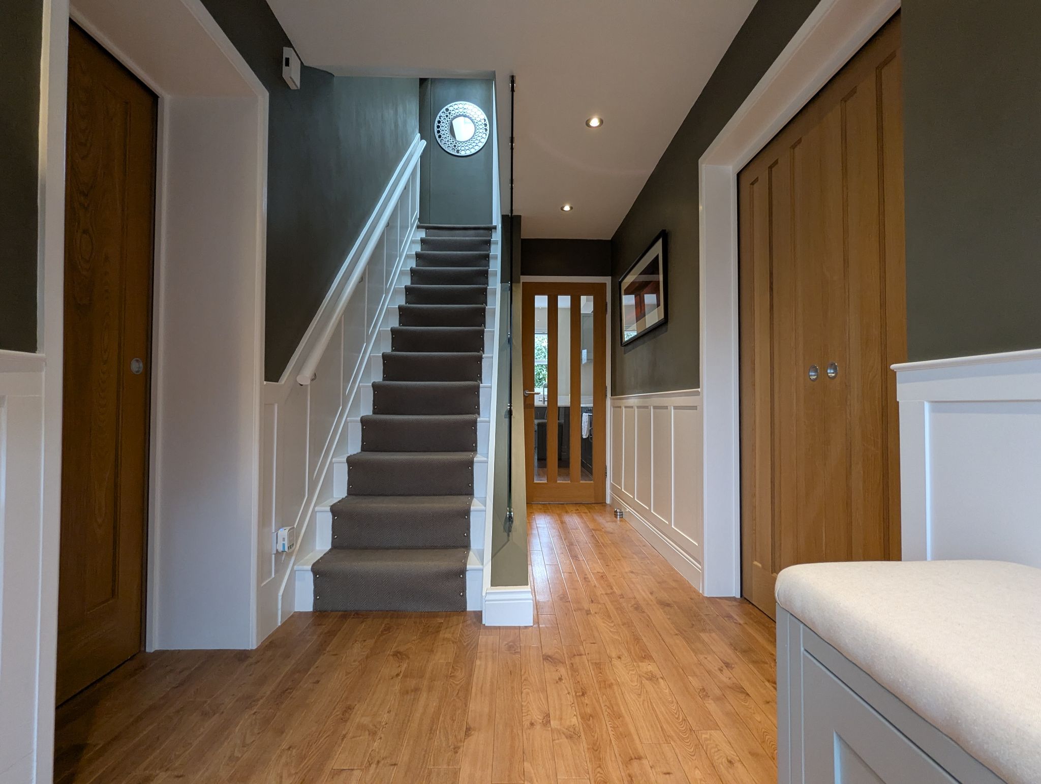 Entrance Hall - We enter via a UPVC front door to be greeted with a stylish entrance hall presented with Karndean flooring which flows through the entire ground floor, a low height wood panelled feature to each wall which continues up a staircase with a carpet runner and decorative glazed panel. Sliding internal doors offer access to the lounge and a separate living room while an internal French door offer access to the kitchen towards the rear. Wall mounted radiator.