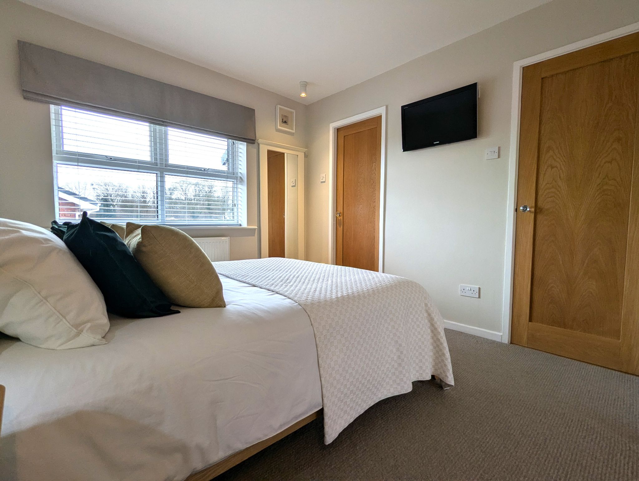 Bedroom One - 12'6 x 9'9 (3.84m x 3.01m) - Beautifully decorated and carpeted bedroom with a low height wood panelled wall feature and fitted adjustable wall lights, a front-facing UPVC double glazed window and wall mounted radiator. Access to an ensuite and walk-in wardrobe via a set of internal double French doors.