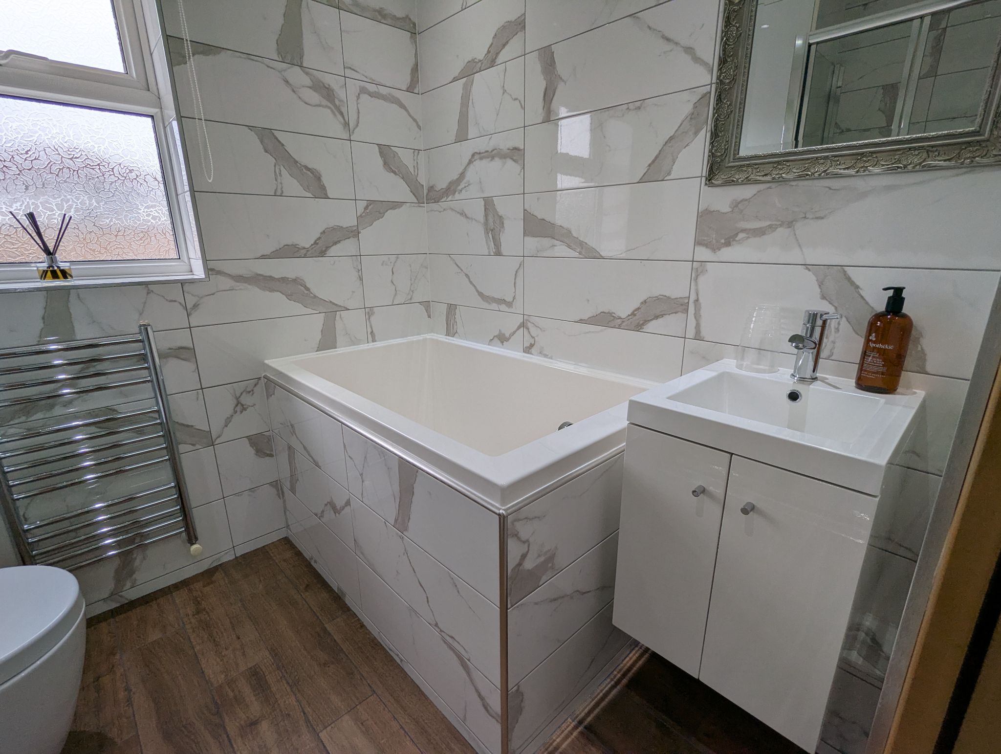 Family Bathroom - 5'7 x 5'9 (1.73m x 1.79m) - Stunning bathroom range with wood style tiled flooring and white marble effect full height tiled splashback. offering access to a toilet, wash basin, Japanese soaking tub and walk-in shower unit with a mains supplied rainfall style mixer shower. Enclosed Baxi combination boiler. Rear-facing UPVC double glazed window. Wall mounted heated towel rail and extractor fan.