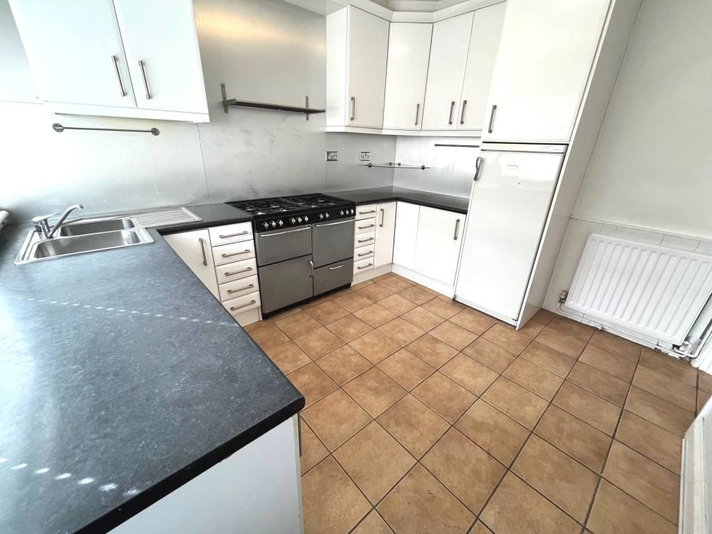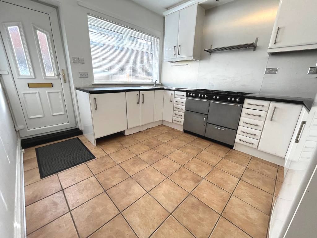 Kitchen - 10'3" x 9'4" (3.12m x 2.84m) White wall and base units, fitted double stainless steel sink and drainer, mixer tap, 8 ring gas RANGE oven, plumbed for a washing machine and dishwasher, fitted larder fridge, radiator, tiled flooring, Upvc double glazed window to rear and Upvc double glazed door to rear.