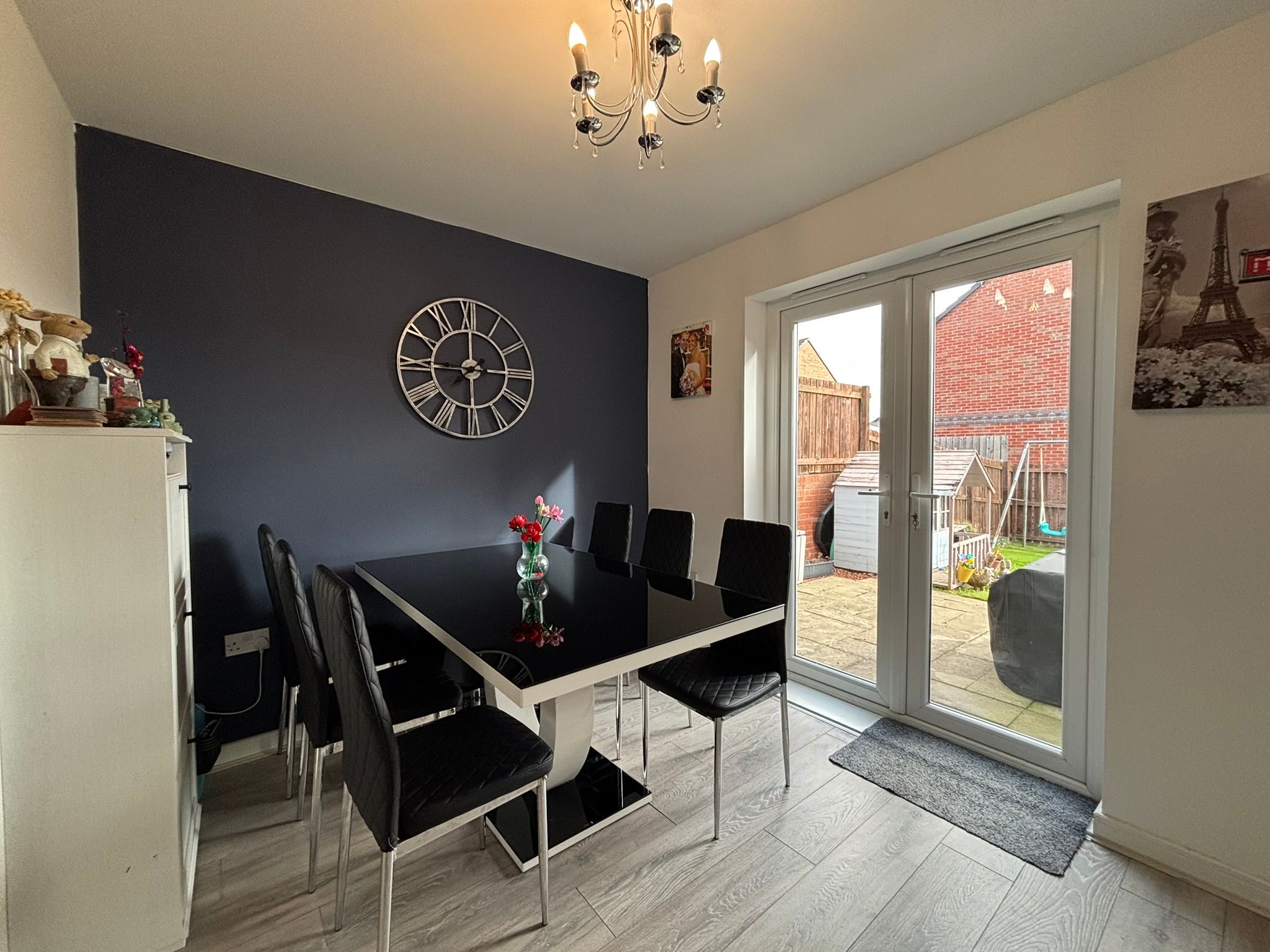 Dinning Room 10'5 x 12'8 Leading into the rear garden via patio doors, wall mounted radiator, laminate flooring, pendant light fitting