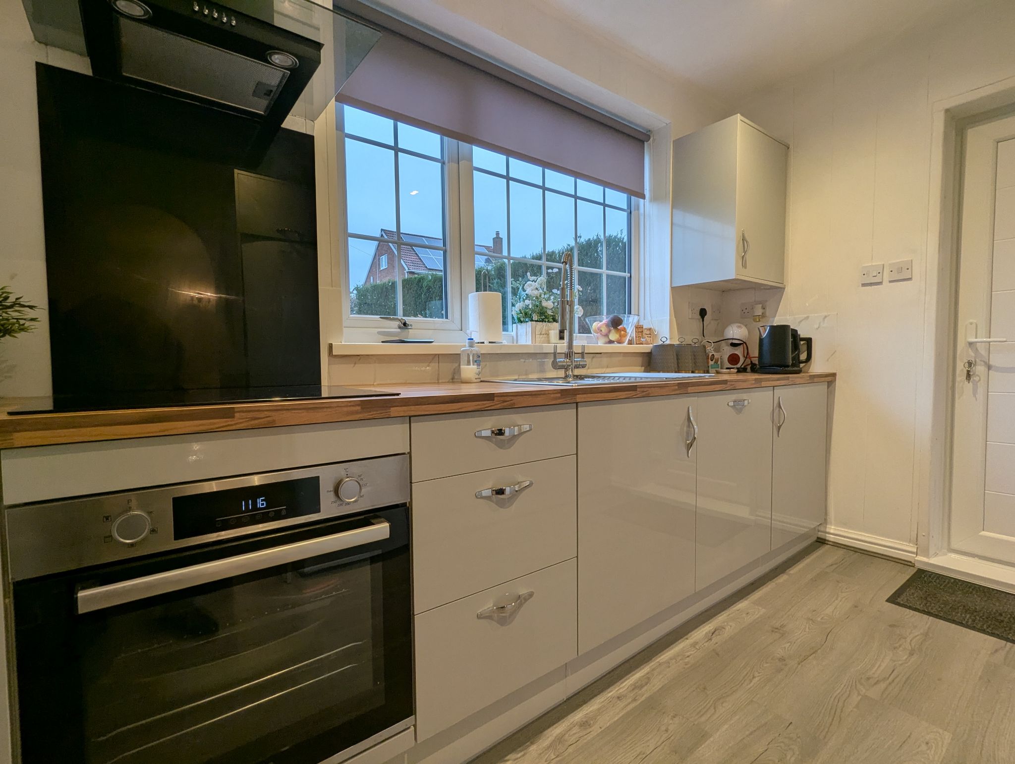 Kitchen - 10'3 x 8'4 (3.13m x 2.56m) - Laminate flooring, access to a range of stylish base and wall kitchen units with work surfaces. Integrated appliances include an electric oven and separate hob with an overhead extractor fan along with a dishwasher. Space for a freestanding fridge/freezer. Stainless steel sink with hose-style mixer tap below a side-facing uPVC double glazed window and uPVC door leading to the rear garden. Wall mounted radiator.