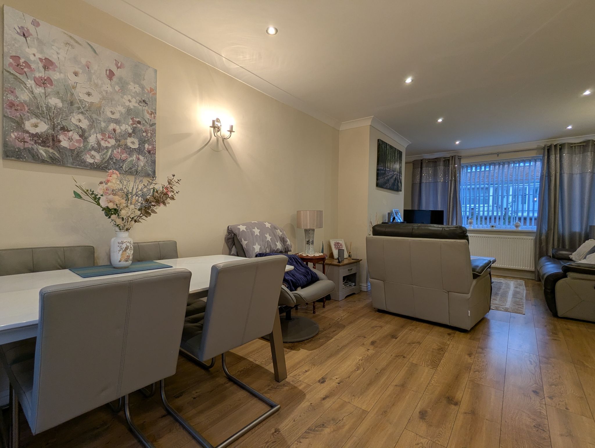 Entrance Hall - Laminate flooring and side-facing uPVC double glazed window, access to a lounge/diner, kitchen, carpeted staircase to the first floor and under stairs cupboard.