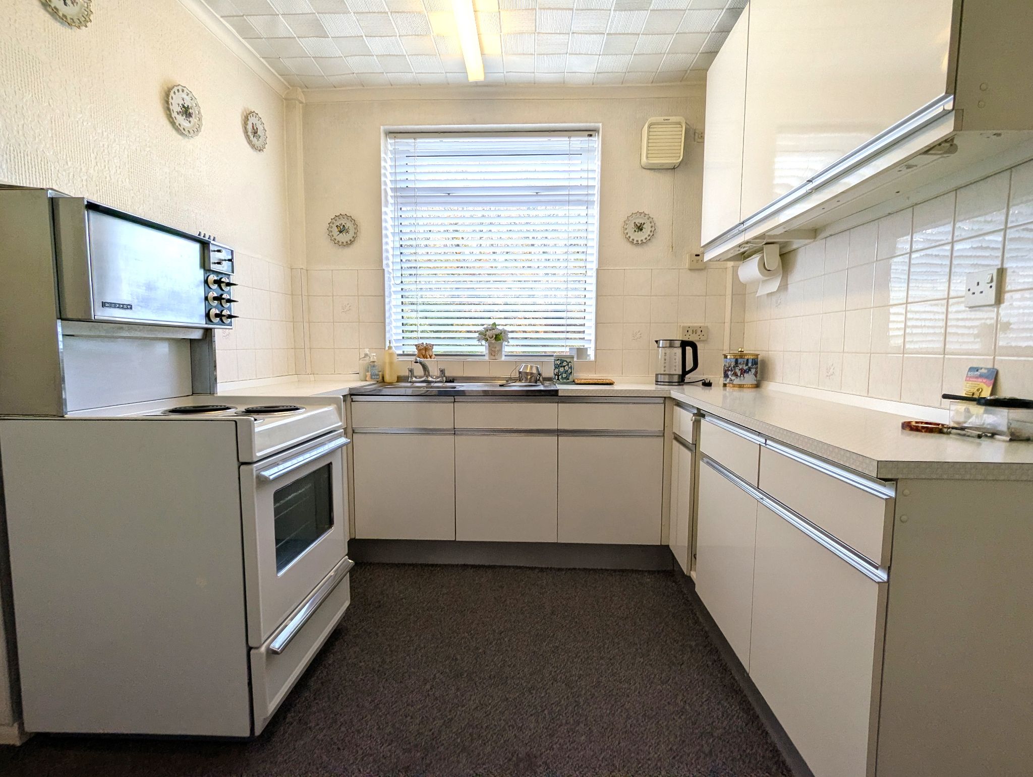Kitchen - 11'8 x 8'2 (3.61m x 2.51m) - Carpeted kitchen with a range of fitted base and wall units, work surfaces and tiled splashback. Space for a standalone cooker and fridge/freezer. Stainless steel sink with mixer tap below a rear-facing UPVC double glazed window. Built-in cupboard, wall mounted radiator and access to the garage.