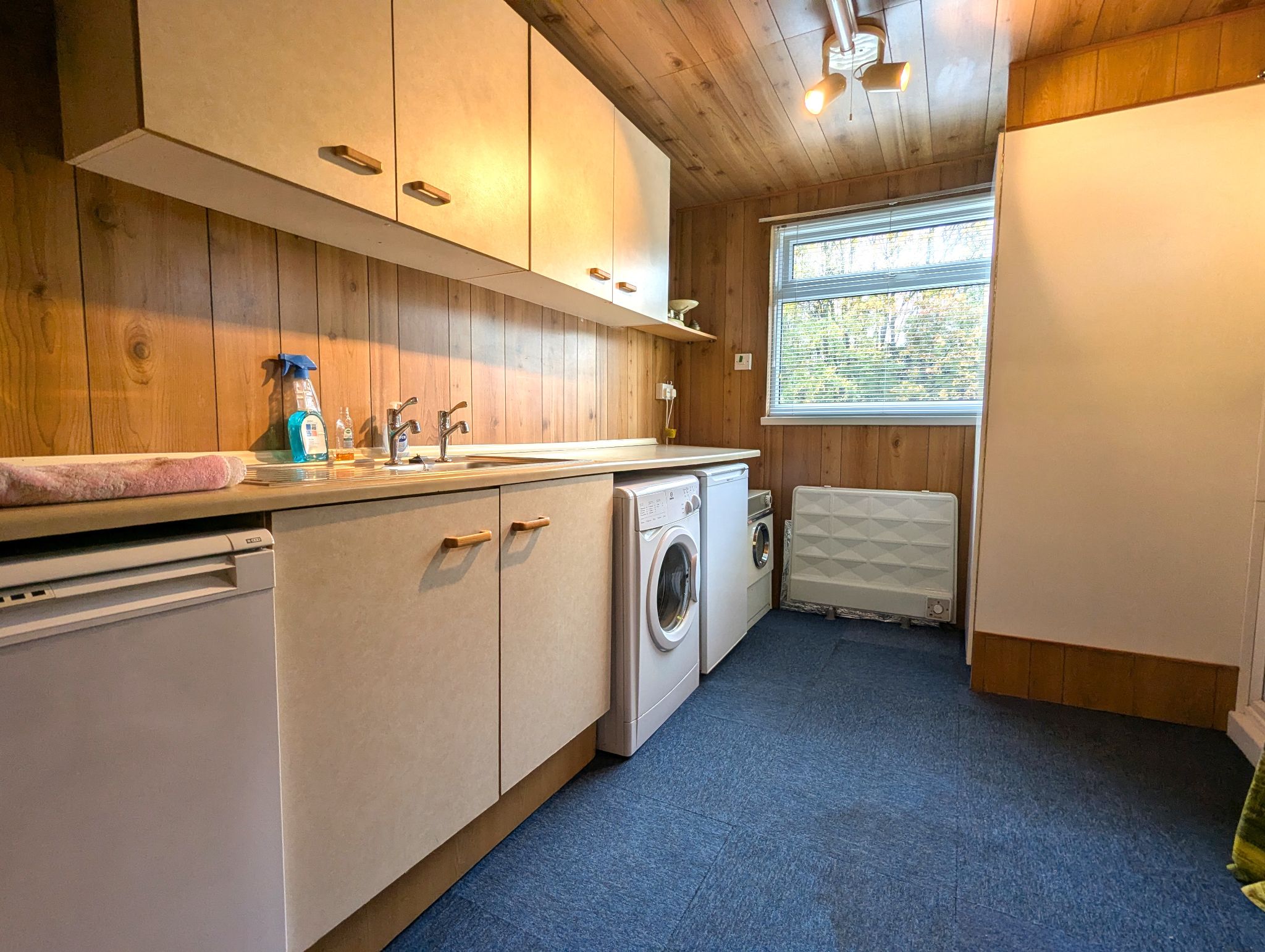 Garage/Utility/WC - Garage (20'2 x 7'8 (6.16m x 2.38m)) with up and over door, power and lighting, access to the rear for the utility (10'8 x 7'4 (3.32m x 2.28m)) with carpet tiles and wood wall panelling. Access to fitted units and work surfaces. Space for standalone washing machine, tumble dryer and under counter fridge and separate freezer. Boiler. Enclosure for a WC. Rear-facing UPVC double glazed window and UPVC door to the rear garden.