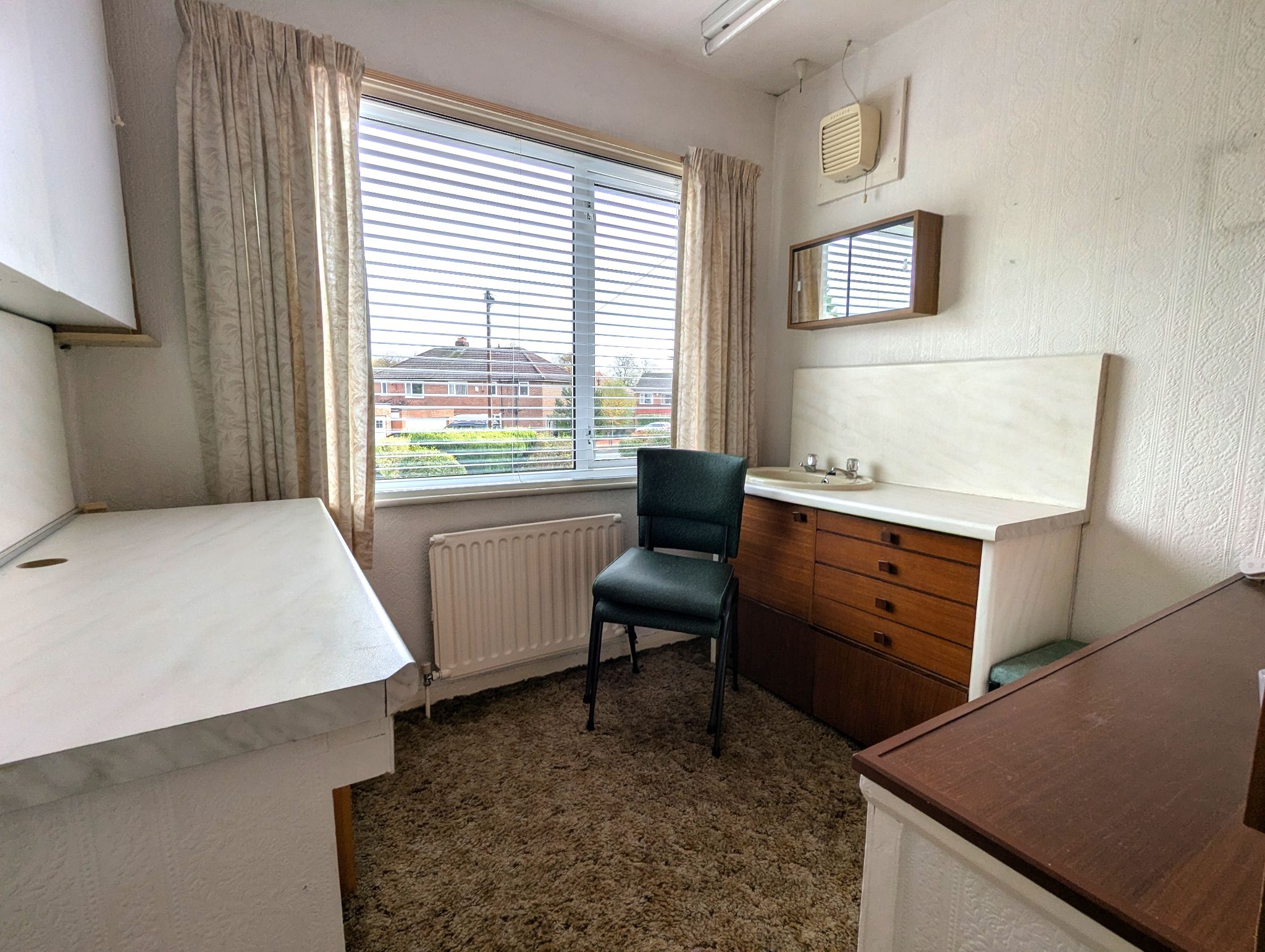 Bedroom Three - 8'1 x 8'1 (2.47m x 2.47m) - Carpeted bedroom with a front-facing UPVC double glazed window. Previously used as a work space with fitted units, work surfaces and wash basin. Wall mounted radiator.