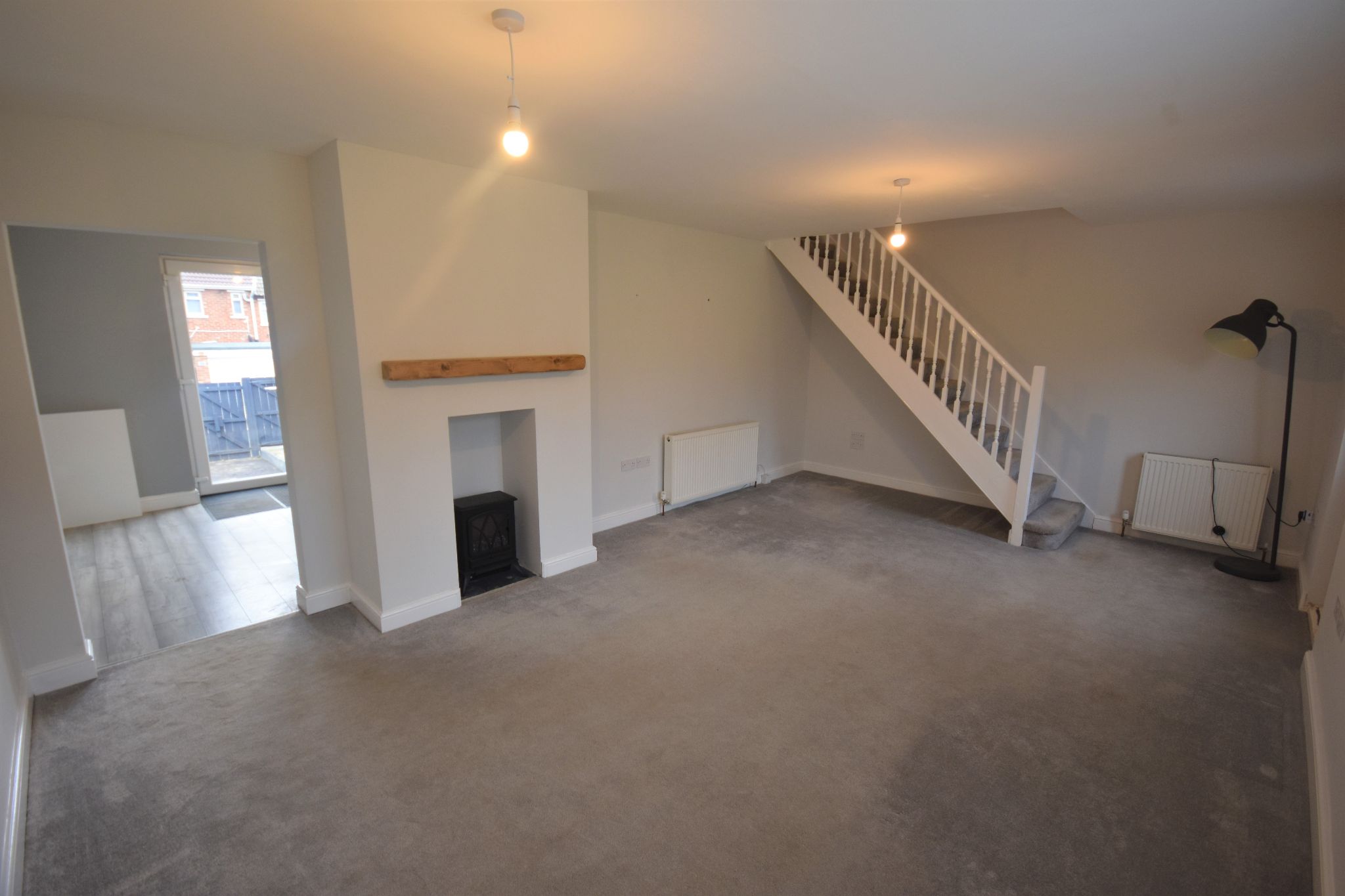 Lounge 6.15m x 3.9m - Spacious lounge with stairs leading to the first floor, UPVc double glazed window to the front, Two wall mounted radiators, Electric fire.