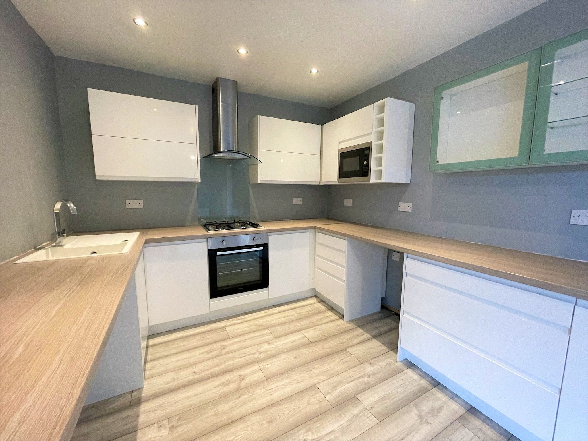 Kitchen 6.1m x 2.5m Modern fitted kitchen/diner with white high gloss units with contrasting worktops, Splashback, Laminate flooring, Pendant light fitting, access to rear garden, UPVc double glazed window to the side, Integrated Fridge/Freezer, Gas hob, Electric Oven, Extractor fan.