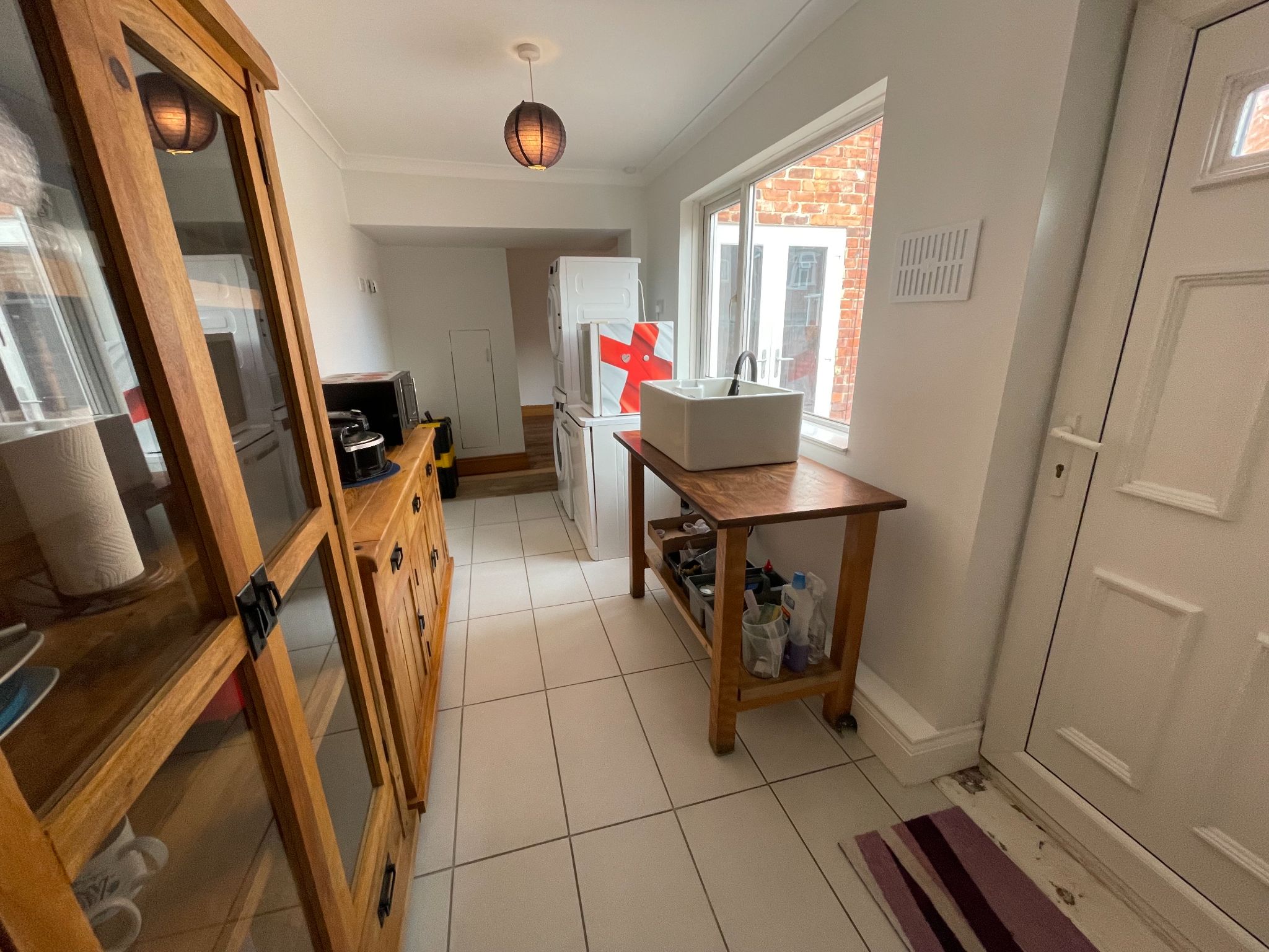 Kitchen Area: 4.933m x 1.988m - Space for stand alone cooker, pendant light fitting, washing machine & dishwasher available, tiled flooring.