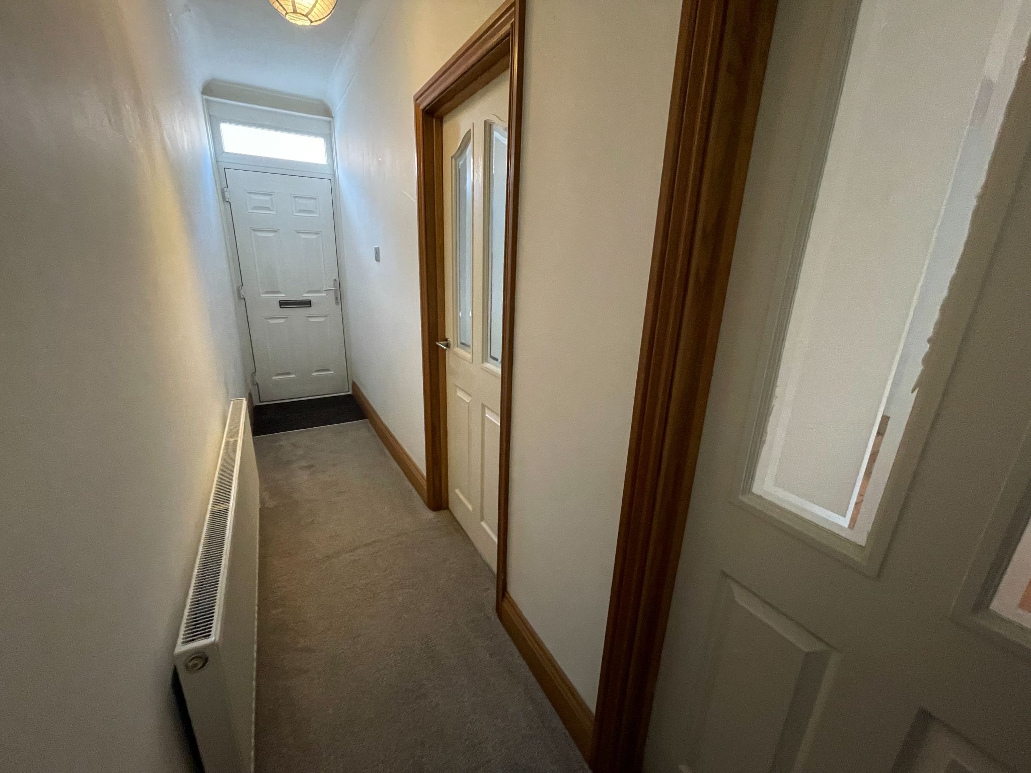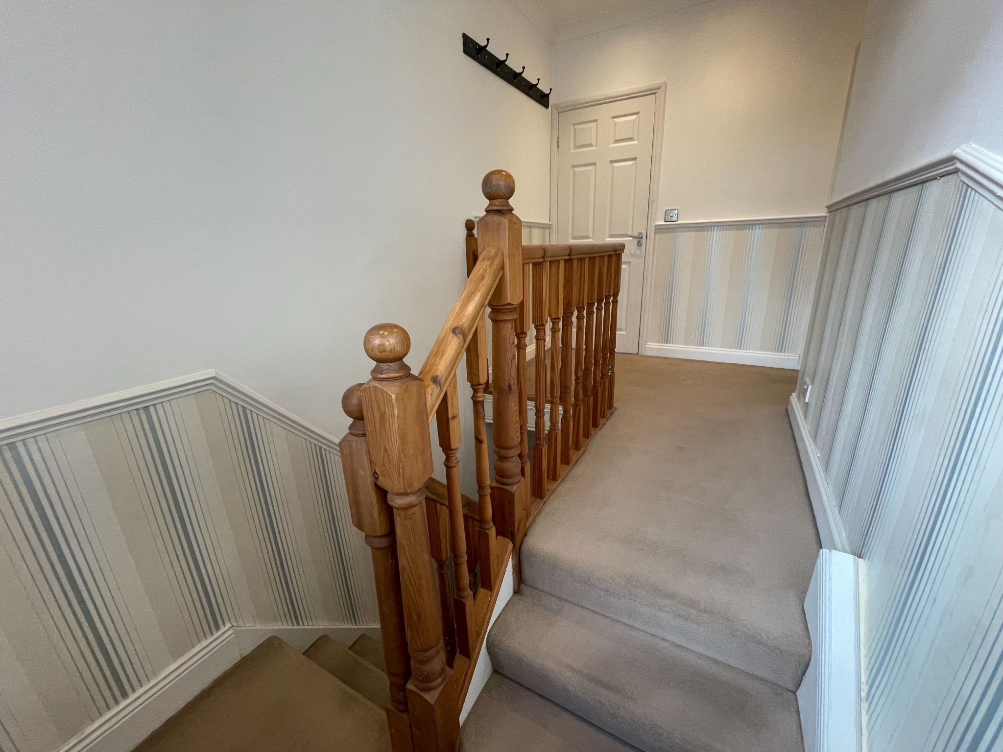 Hallway: 4.681m x 0.925m - Radiator, pendant light fitting, carpeted flooring.