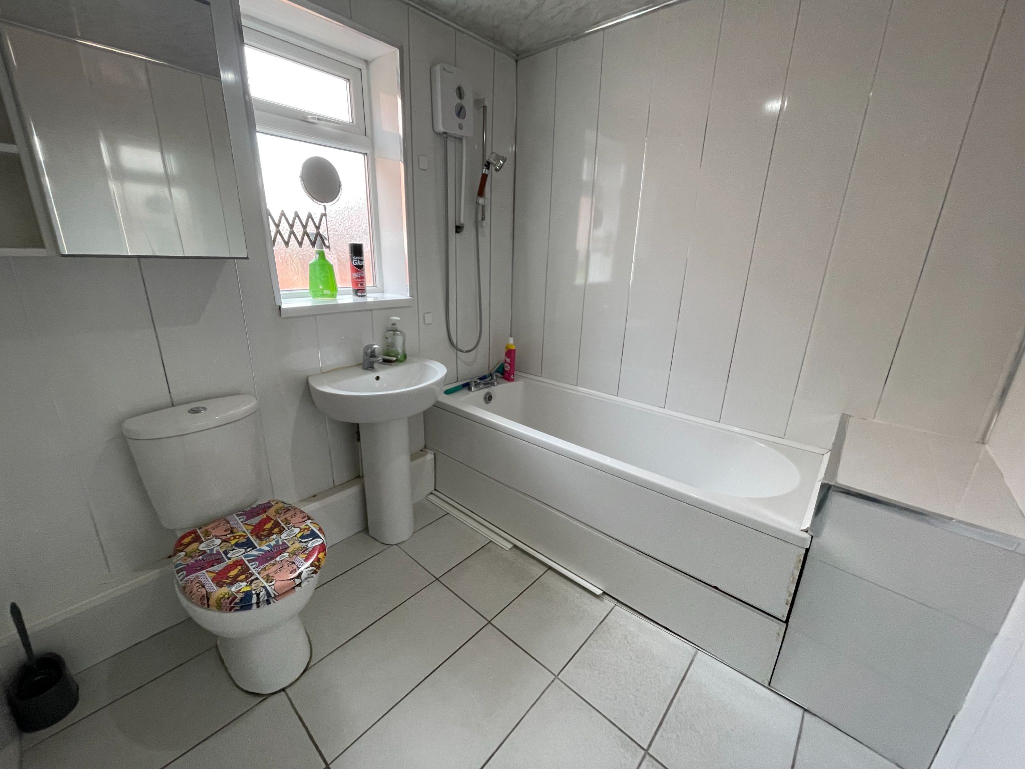 Bathroom: Bath with electric shower above, tiled flooring, cladded walls & ceiling, double glazed window.