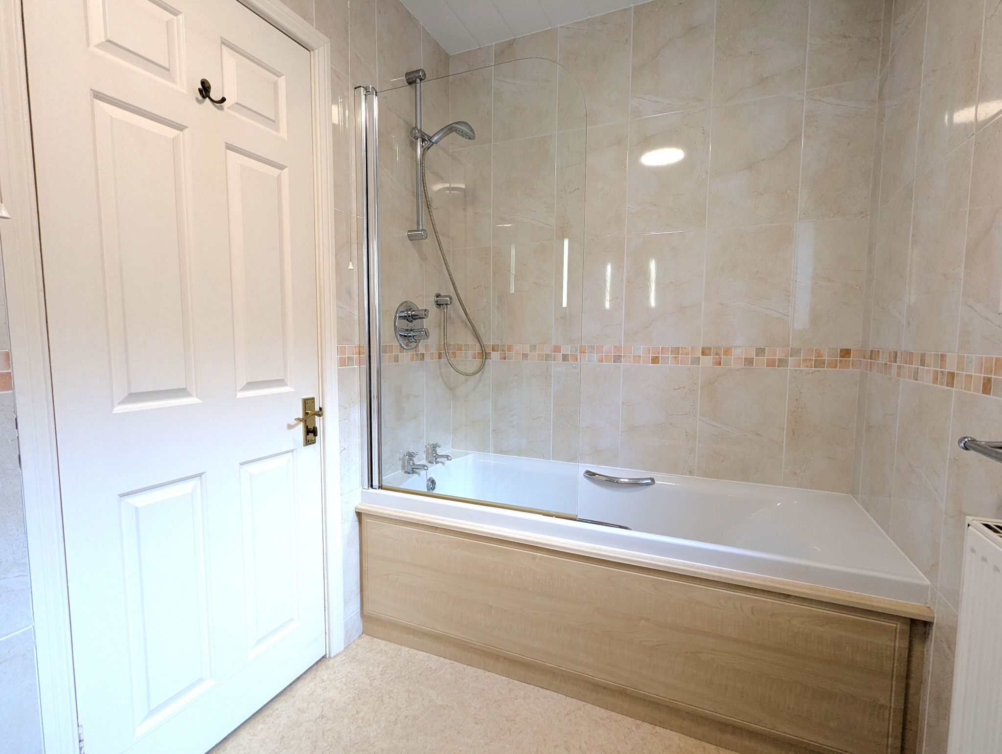 Bathroom - 5'5 x 9'1 (1.65m x 2.77m) - Vinyl flooring with full-height tiled splashback. Access to a 3-piece matching bath suite with a mains mixer shower over the bath. 2 side-facing UPVC double glazed windows and wall mounted radiator.