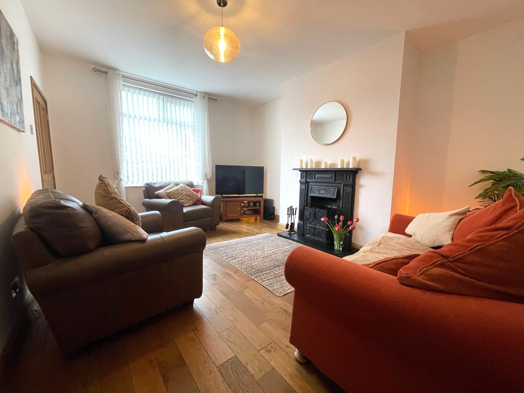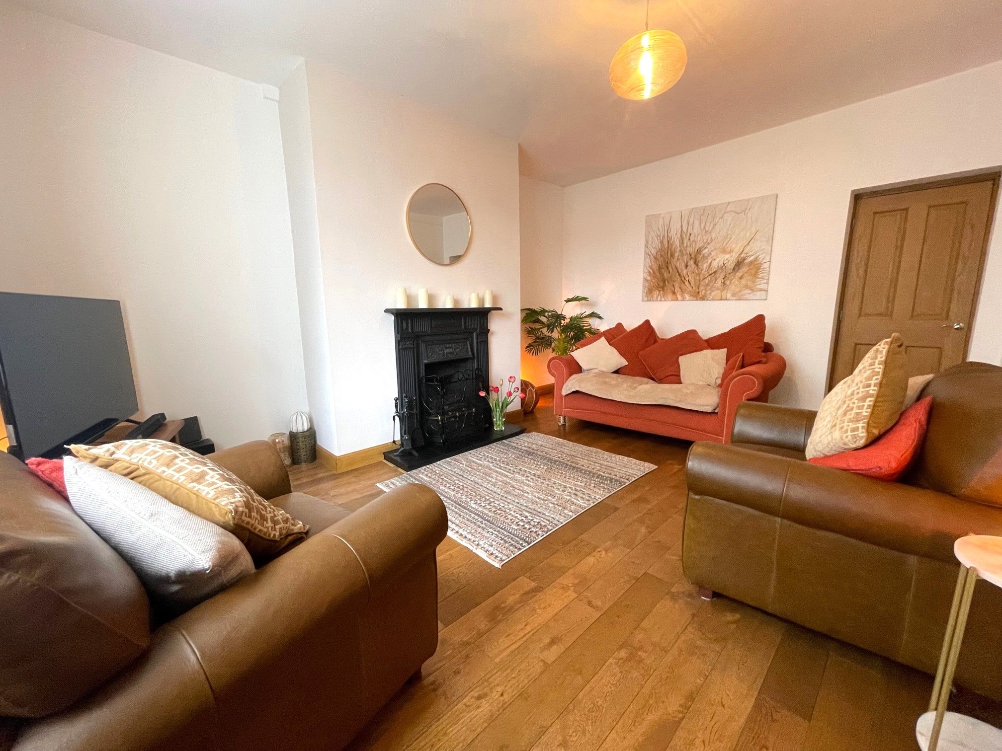 Lounge - 15'9 x 12' (4.87m x 3.66m) - Spacious and brightly decorated lounge with wood flooring, front-facing UPVC double glazed window, wall mounted radiator, decorative vintage fireplace as centrepiece, under stairs cupboard and access to the kitchen towards the rear.