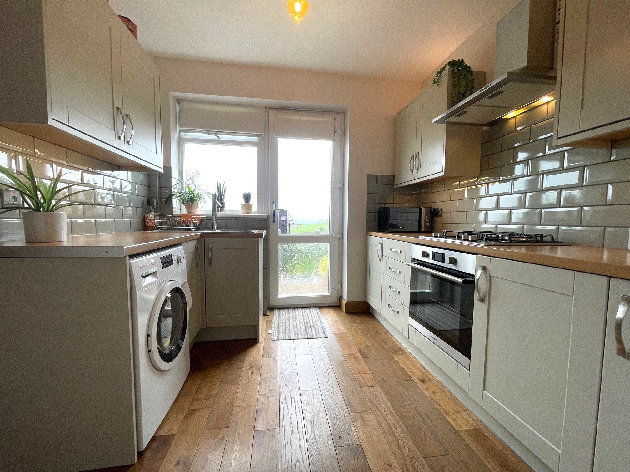 Kitchen - 8'2 x 8'8 (2.51m x 2.71m) - Stunning range of fitted base and wall kitchen units with uplighting, contrasting work surfaces and tiled splashback. Integrated electric oven with gas hob and overhead extractor. Plumbing for a washing machine. Stainless steel sink with a mixer tap. Rear-facing UPVC double glazed window and door looking out onto a rear garden. Wall mounted radiator. Access to a ground floor bathroom.