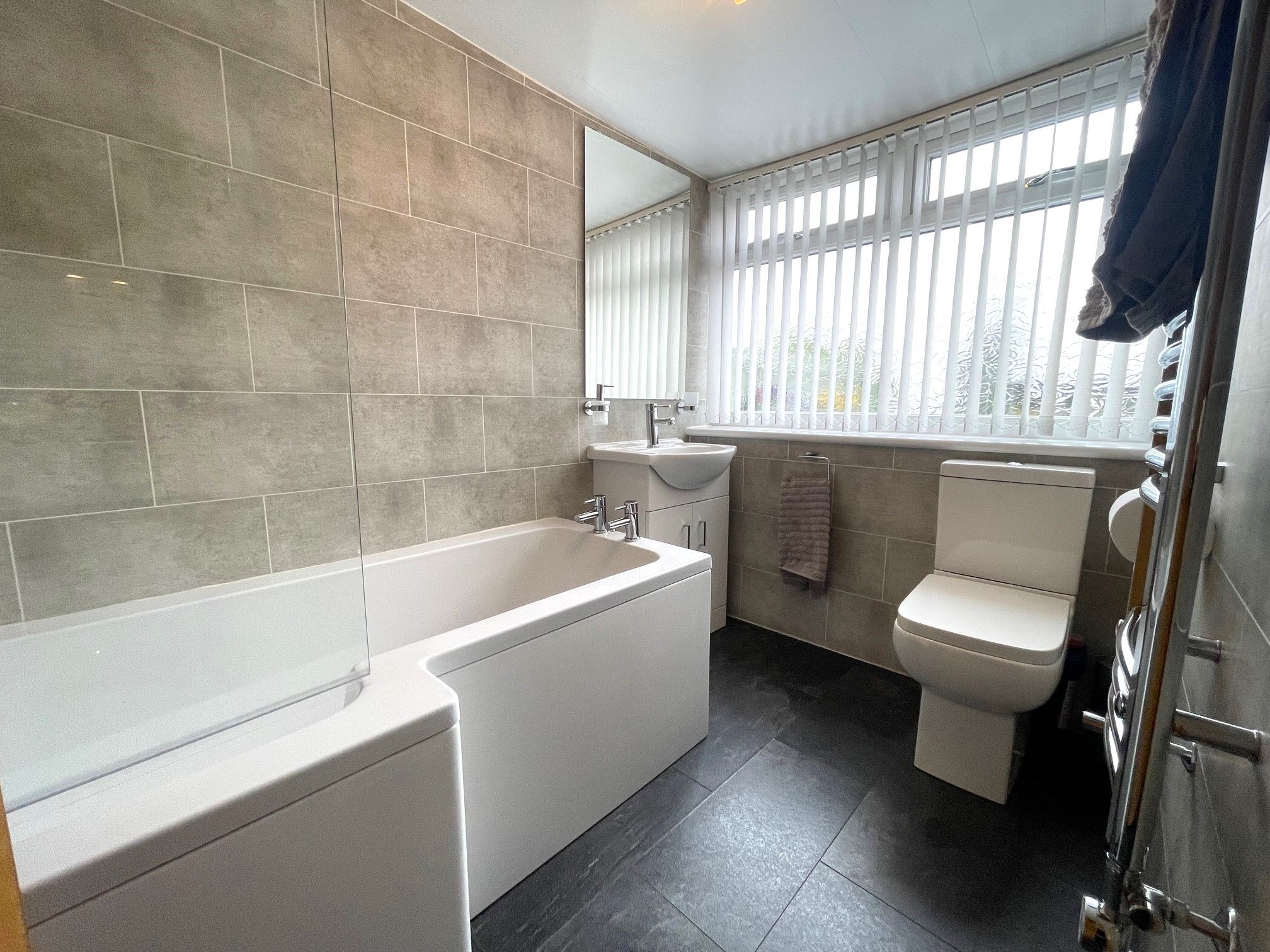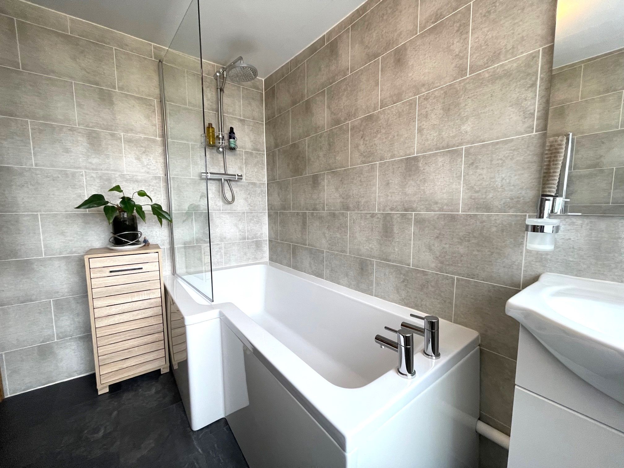 Bathroom - 8'1 x 5'3 (2.48m x 1.64m) - LVT (Luxury Vinyl Tile) flooring and tile effect cladding splashback. Access to a three piece white bath suite with a mains mixer supplied rainfall style shower over the bath. Rear-facing UPVC double glazed window. Heated towel rail.