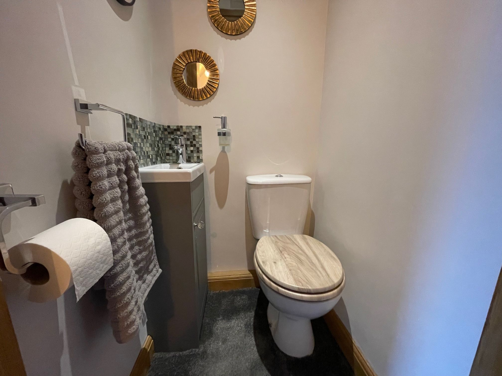 WC - 3' x 2'9 (0.94m x 0.89m) - Carpeted with access to a toilet and wash basin. Extractor fan.