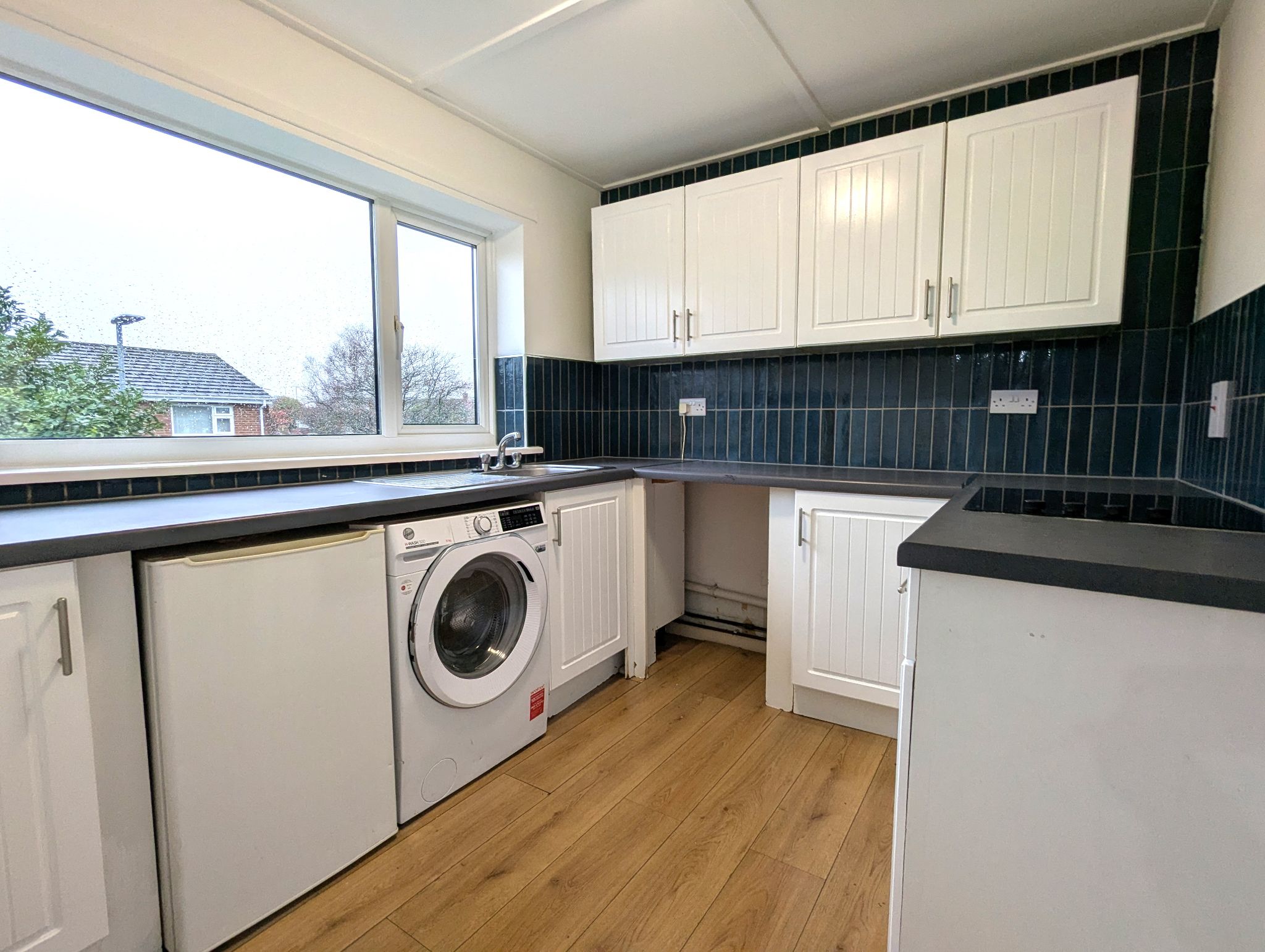 Kitchen - 7'9 x 8'8 (2.41m x 2.69m) - Laminate flooring, range of base and wall fitted kitchen units with work surfaces and tiled splashback. Integrated electric oven and hob. Space for a washing machine and under counter fridge. Stainless steel sink with mixer tap below a rear-facing UPVC double glazed window. Wall mounted radiator.
