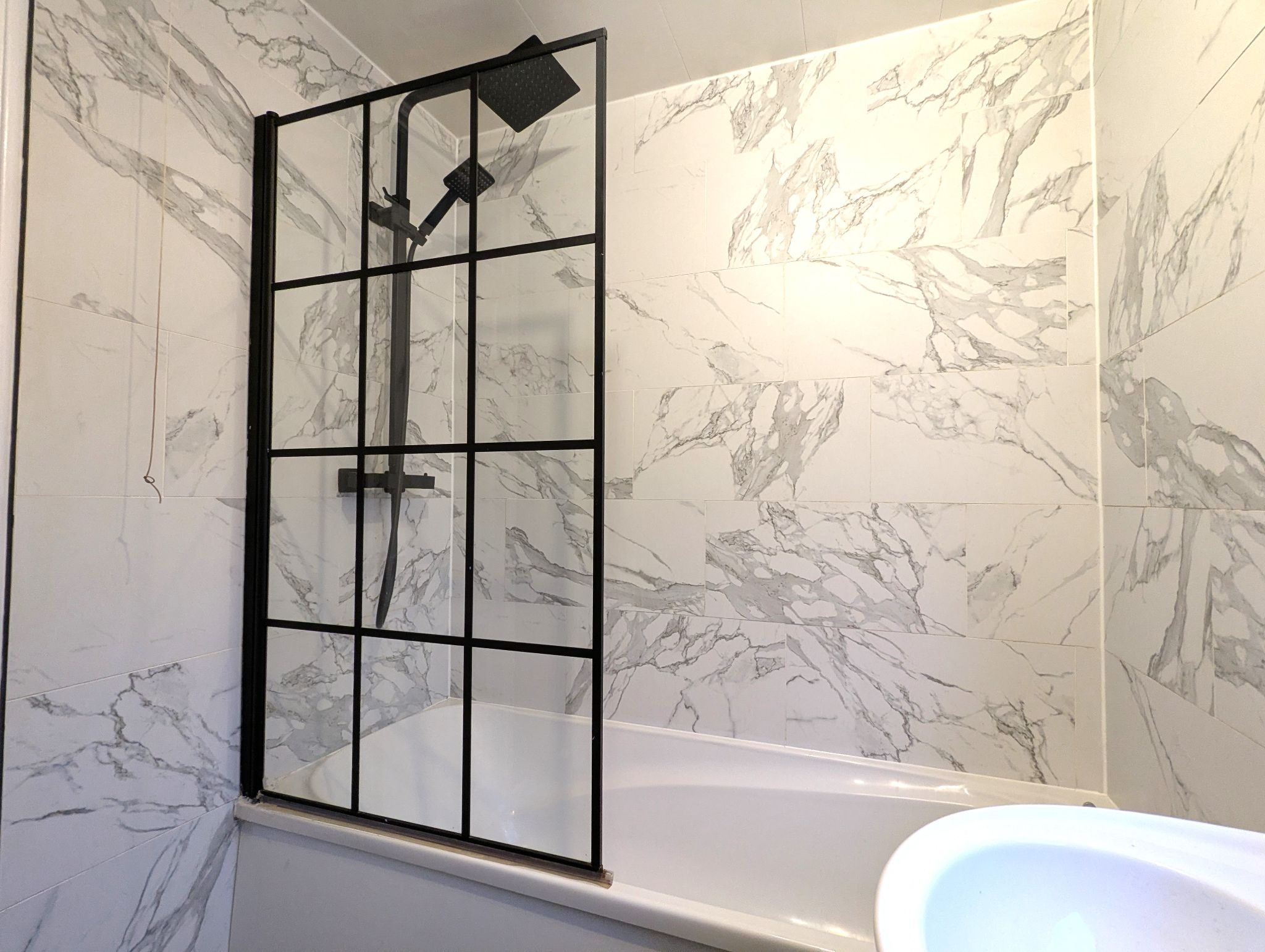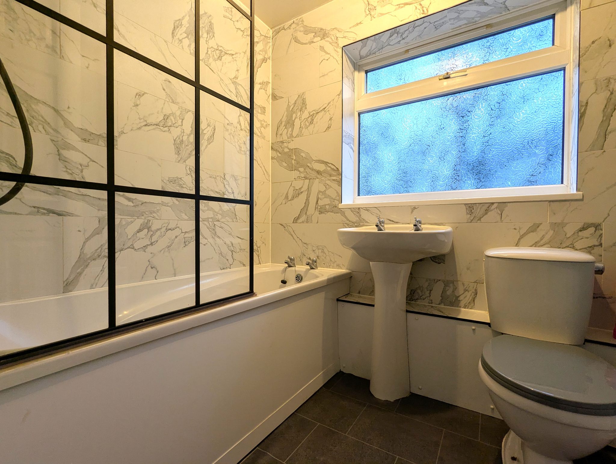 Bathroom - 6'3 x 6'1 (1.93m x 1.86m) - Vinyl flooring and full height tiled splashback, access to a toilet, wash basin and bath with mixer supplied shower with black matt finish. Side-facing UPVC double glazed window and wall mounted radiator.