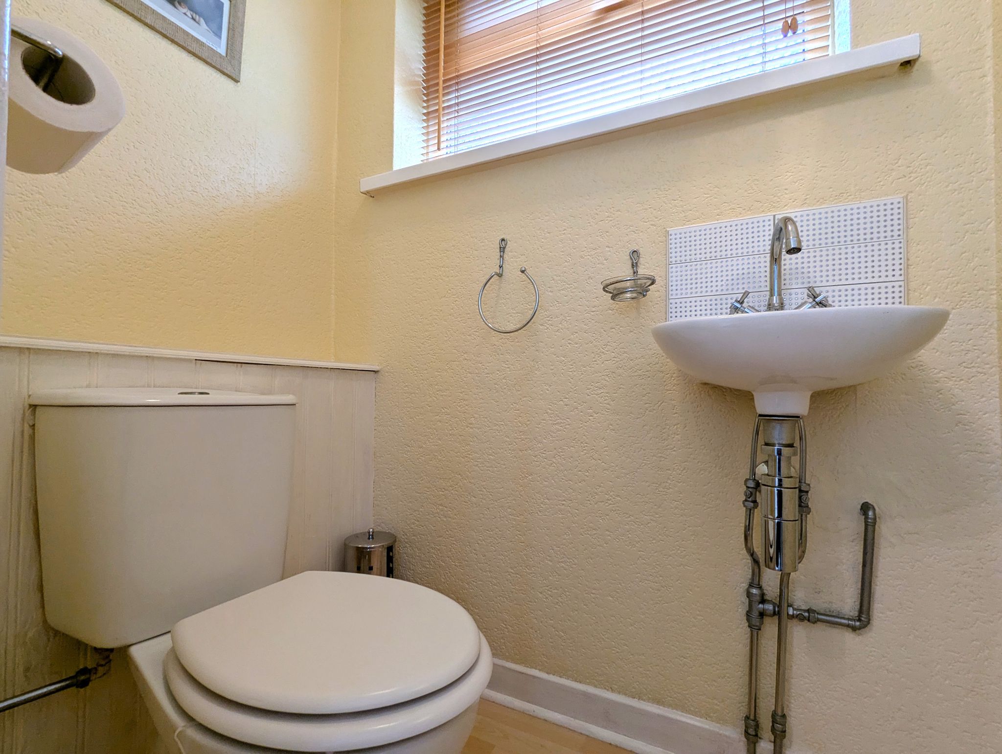 WC - Laminate flooring, access to a toilet and wash basin. Side-facing UPVC double glazed window.