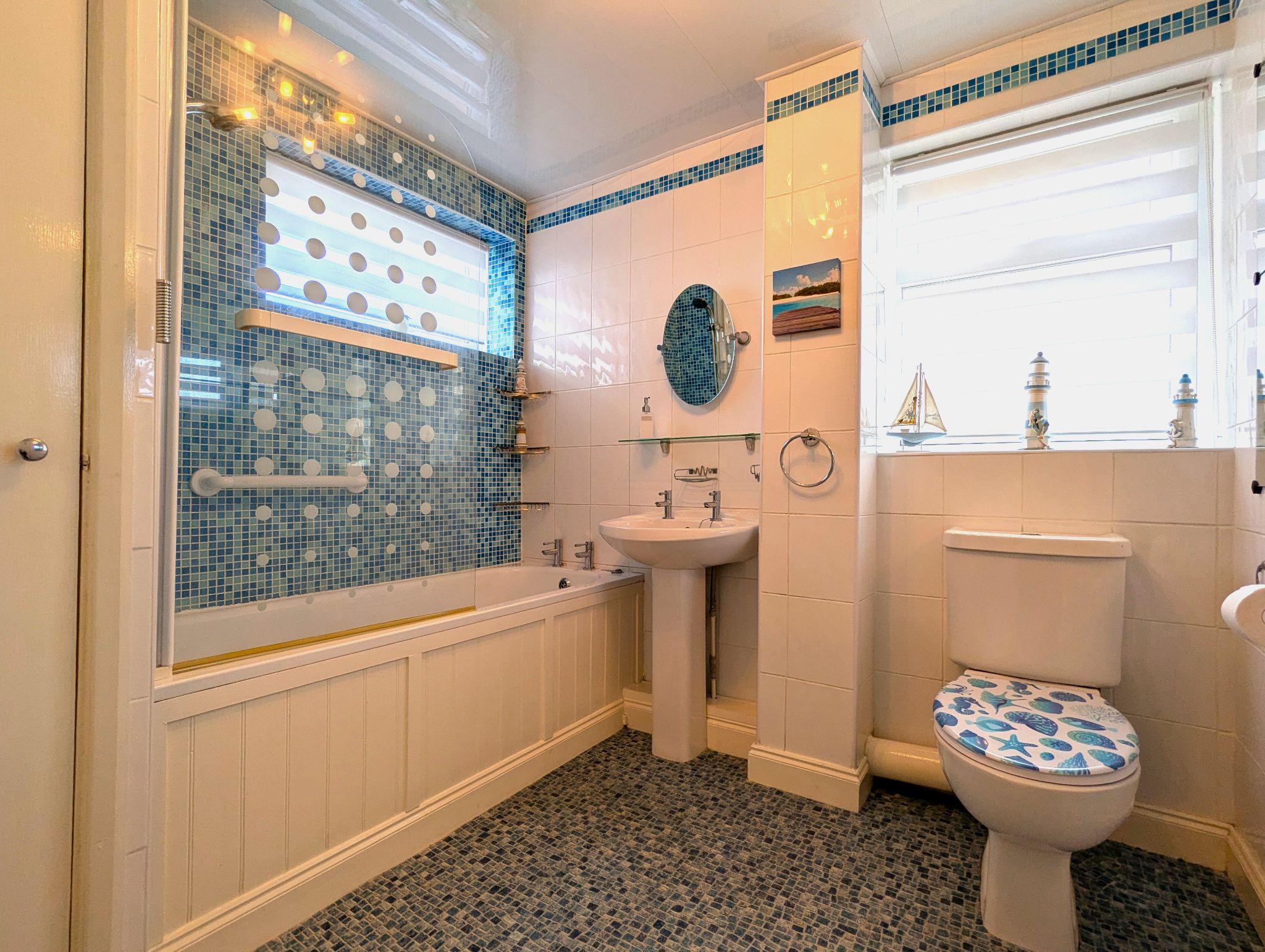 Bathroom - 7'4 x 7'4 (2.28m x 2.27m) - Vinyl flooring with full height tiled splashback, access to a toilet, wash basin and bath with electric shower. Side and rear-facing UPVC double glazed windows. Built-in cupboard and wall mounted radiator.