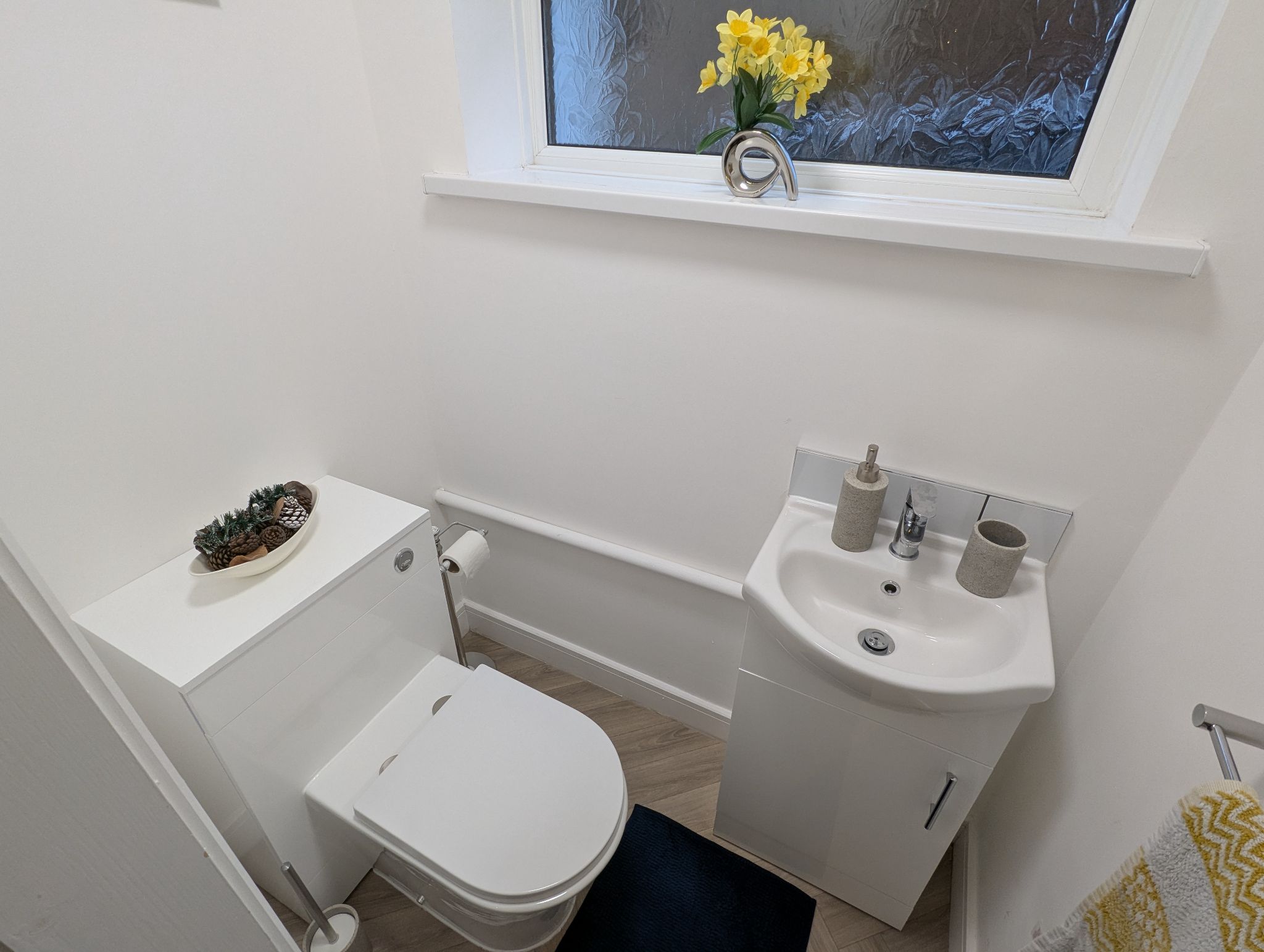 Ground Floor WC. Double glazed Upvc window to side, WC and vanity sink unit.