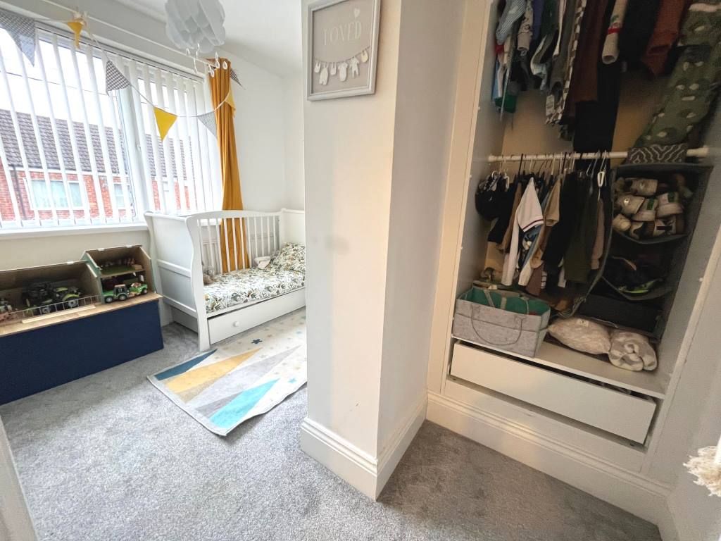 Bedroom 2 - 2.55 x 1.83 with wardrobe section in entrance - featuring double glazed UPVC window to rear, single panel radiator, built in wardrobe, 2 x pendant light fittings & carpeted flooring.