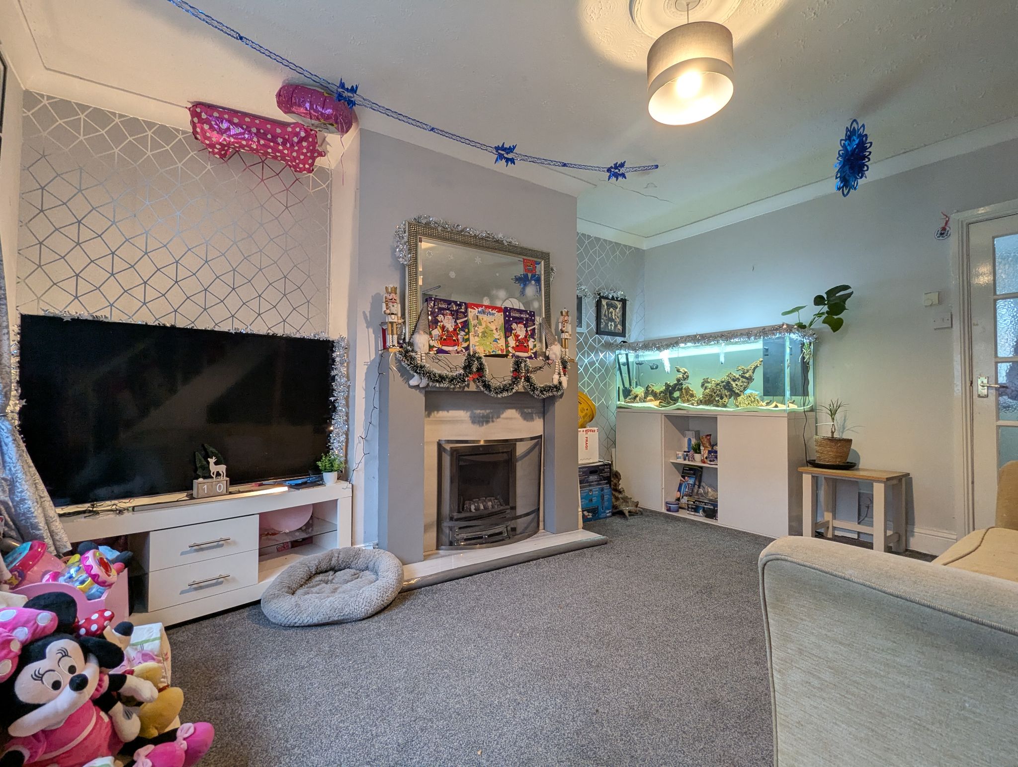 Lounge - 4.38m x 4.56m - featuring double radiator, double glazed UPVC window to front, pendant light fitting, internet point & carpeted flooring.