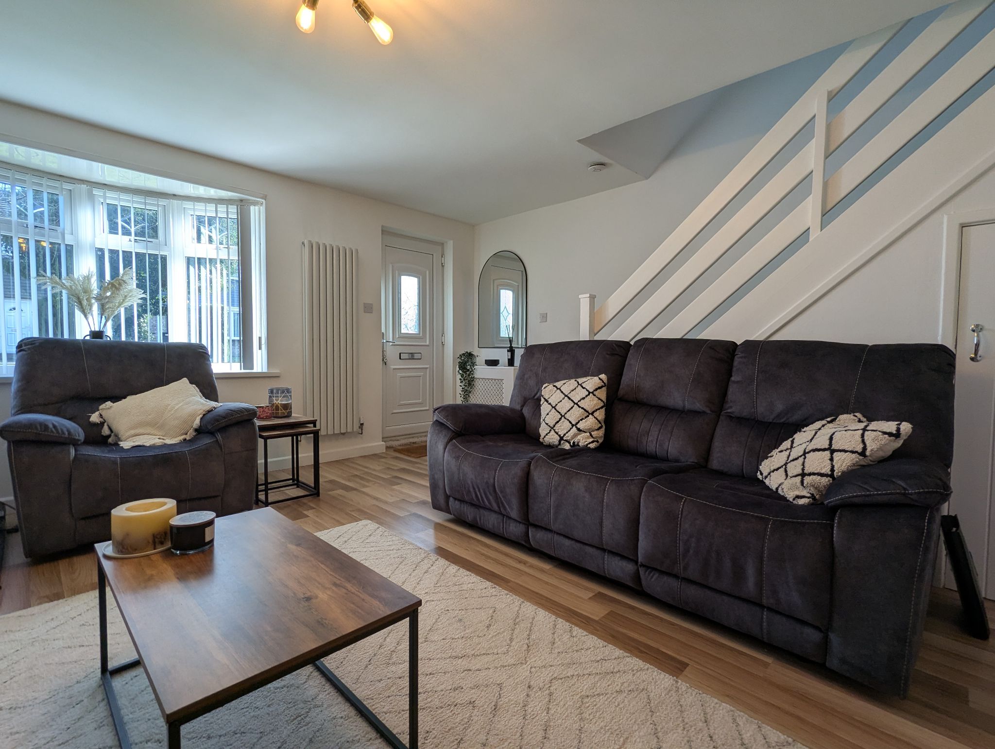 Lounge - 15'5 x 14'8 (4.72m x 4.51m) - Enter via a UPVC front door into a spacious and brightly decorated lounge with Laminate flooring, a front-facing UPVC double glazed bay window, decorative wood panelled feature, 2 wall mounted vertical radiators, carpeted staircase to the first floor with under stairs cupboard and access to the kitchen towards the rear.
