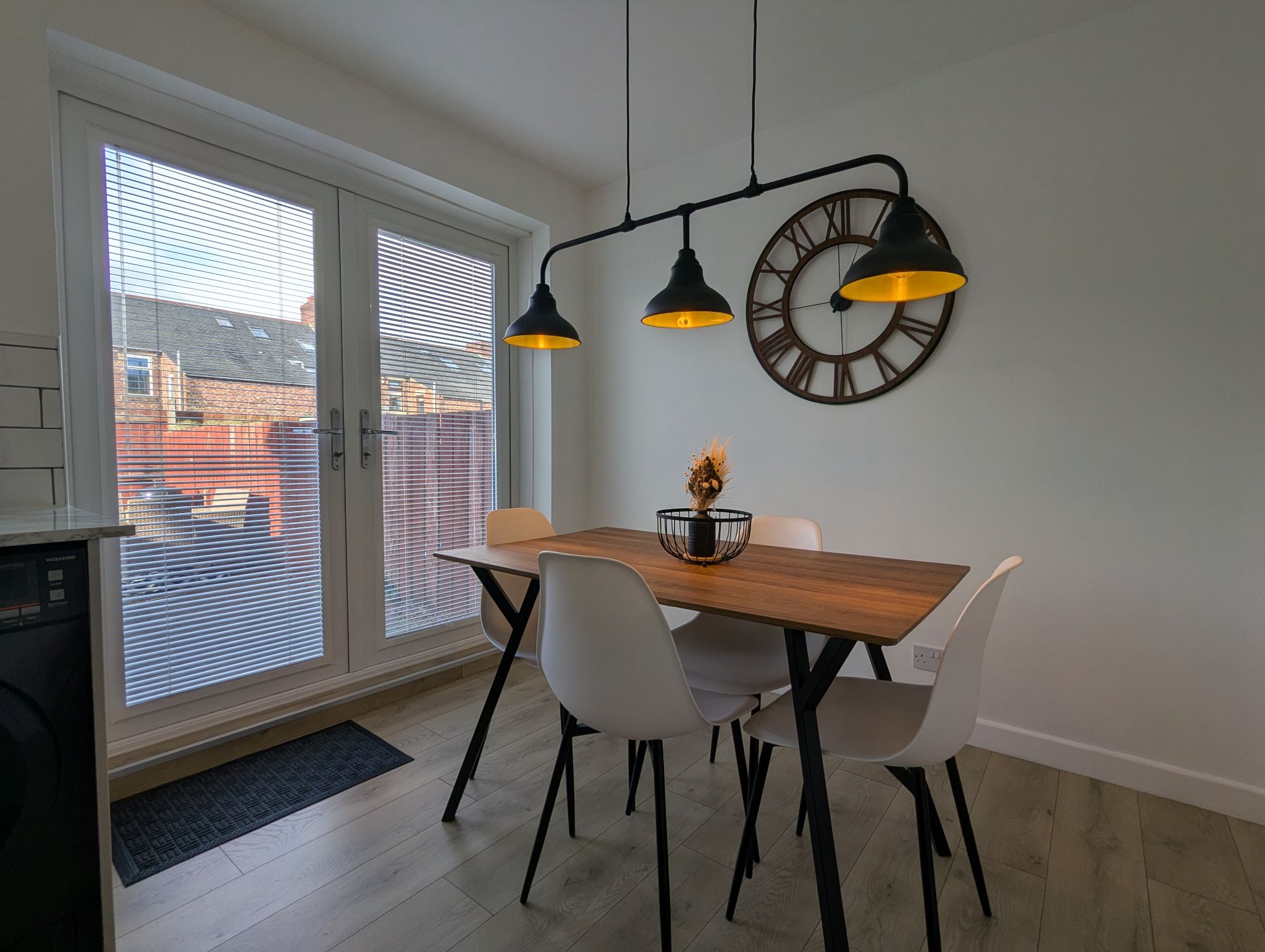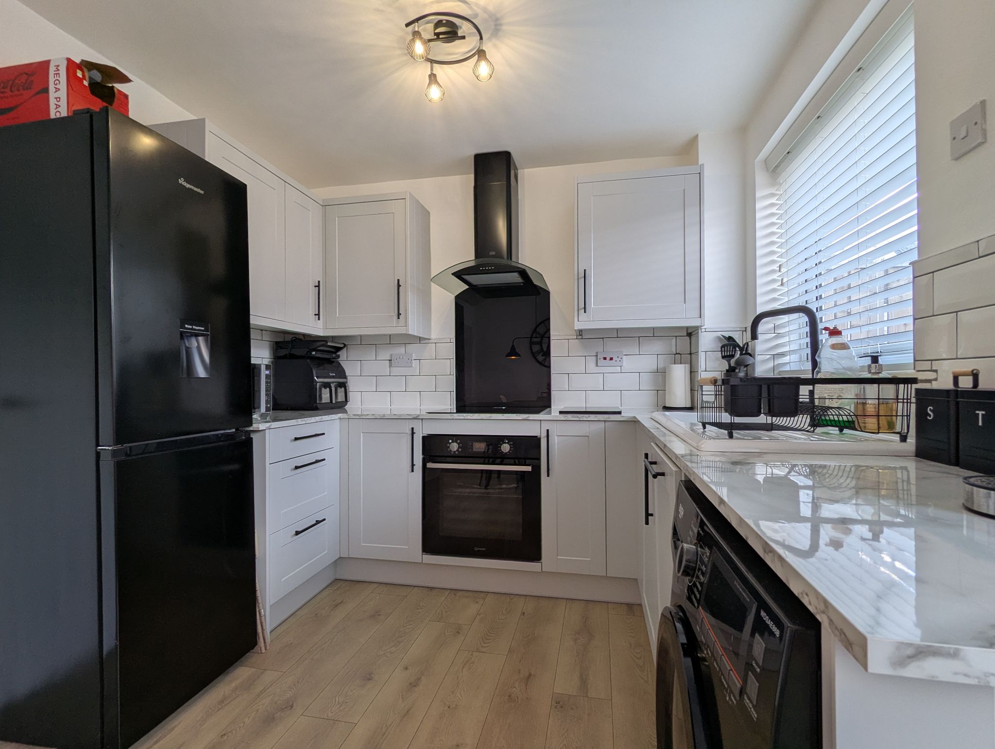 Kitchen/Diner - 8'7 x 14'8 (2.65m x 4.51m) - Laminate flooring, recently fitted modern kitchen with a tiled splashback, integrated electric oven and hob with an overhead extractor and dishwasher. Space for a freestanding washing machine and fridge/freezer. White ceramic sink with a black matt style mixer tap below a rear-facing UPVC double glazed window. UPVC French doors leading a to a rear garden. Wall mounted vertical radiator.
