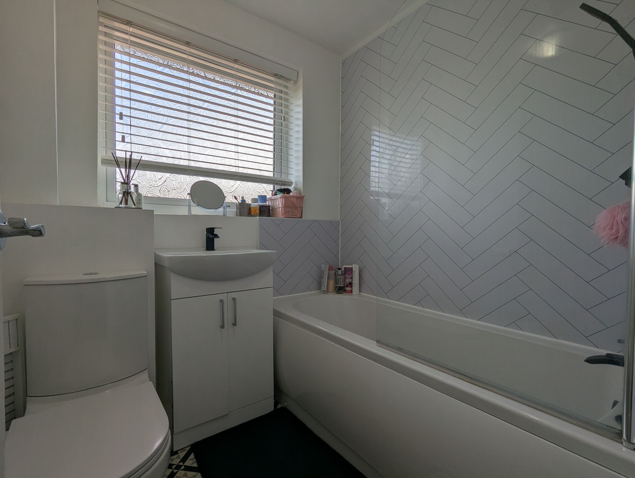 Bathroom - 5'8 x 6'1 (1.76m x 1.85m) - Modernised bathroom with vinyl flooring, matching 3-piece white bath suite with black matt mixer shower and cladding splashback. Rear-facing UPVC double glazed window and black matt wall mounted heated towel rail.