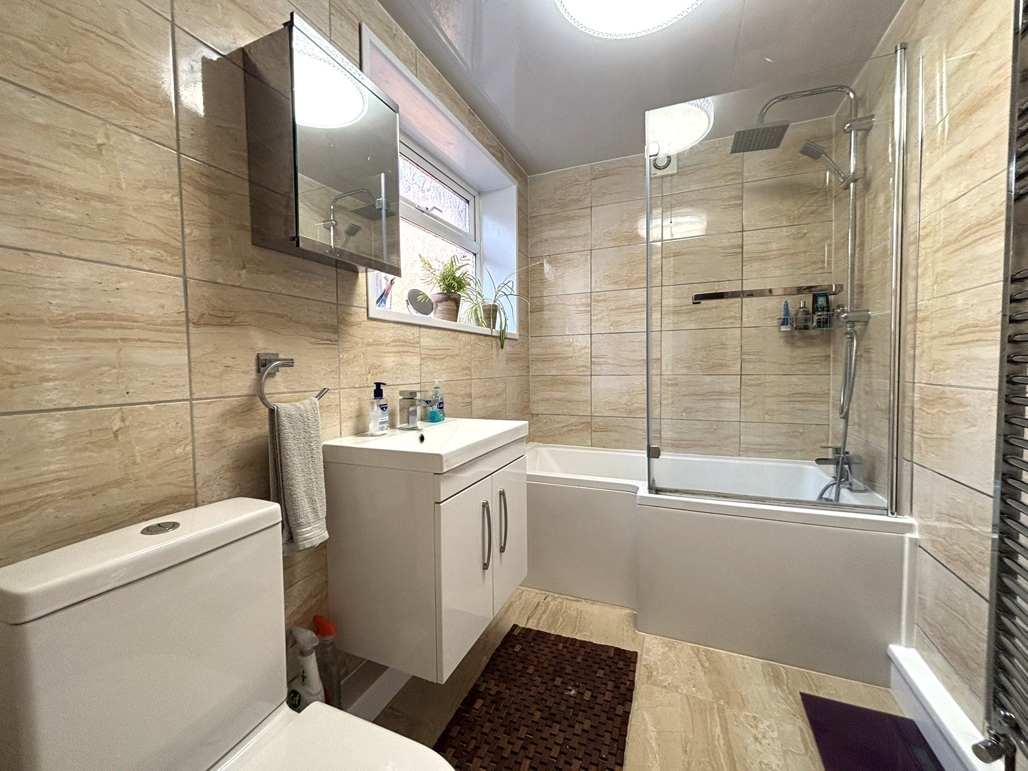Main Bathroom - 5'6 x 6'2 (1.73m x 1.90m) - Double glazed window to rear, tiled walls with vanity unit, wash basin, WC and P-shaped bath with over bath shower