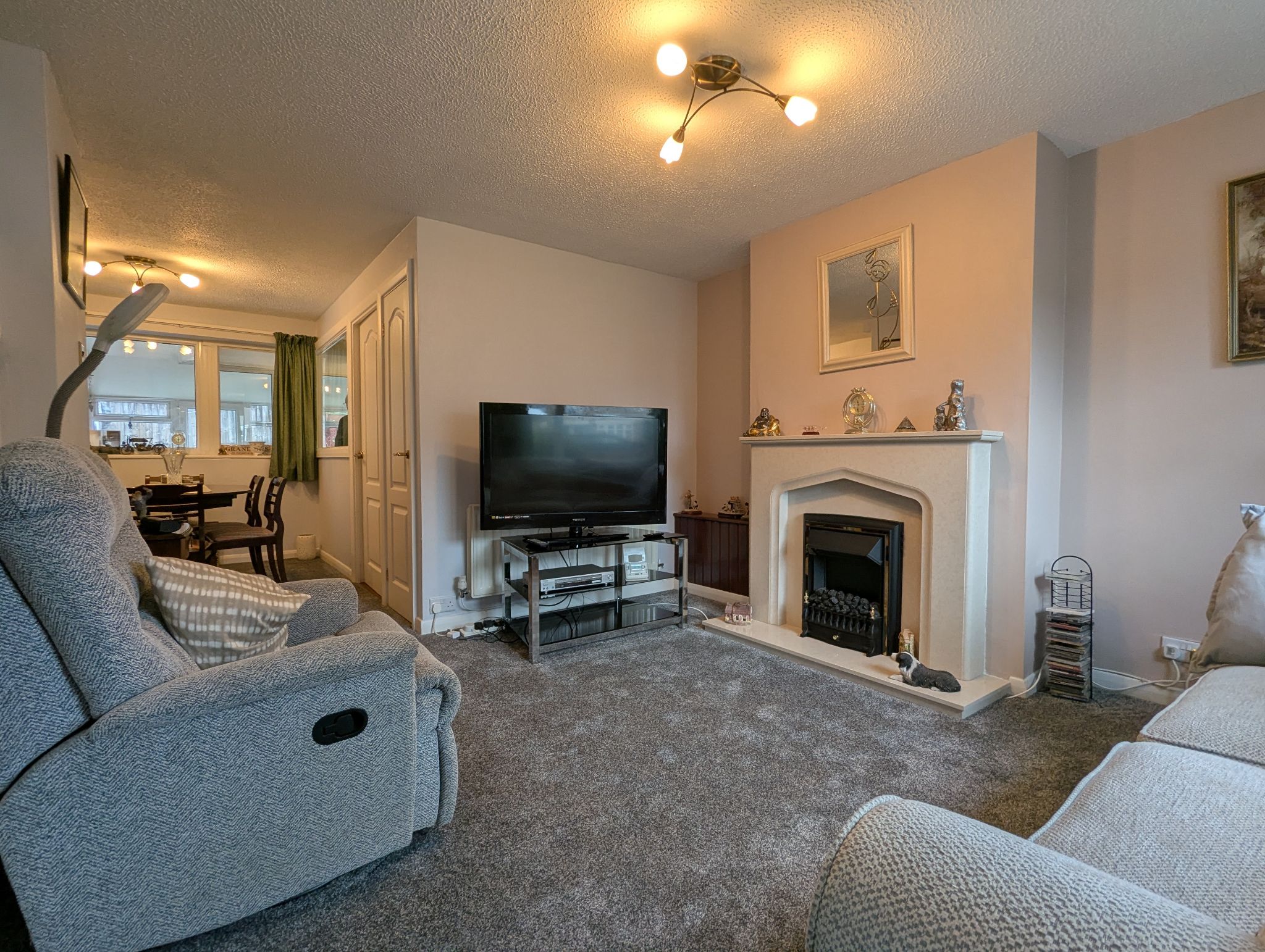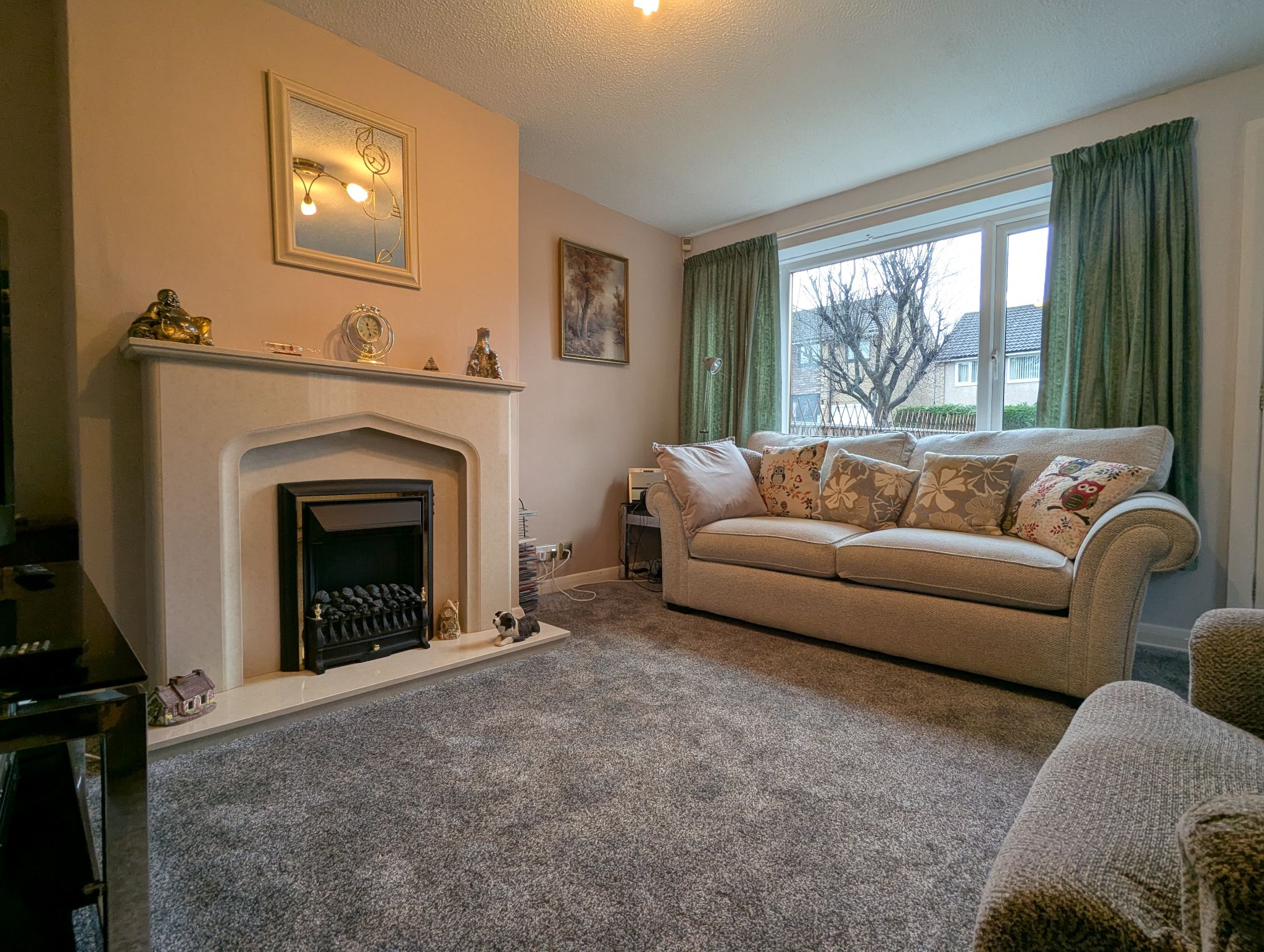 Lounge - 12'8 x 14'2 (3.92m x 4.34m) - Step into a carpeted lounge with open access to the dining area to the rear and carpeted staircase to the first floor. There is a front and separate side-facing window, both double glazed. Wall mounted radiator and an electric fireplace with marble surround.