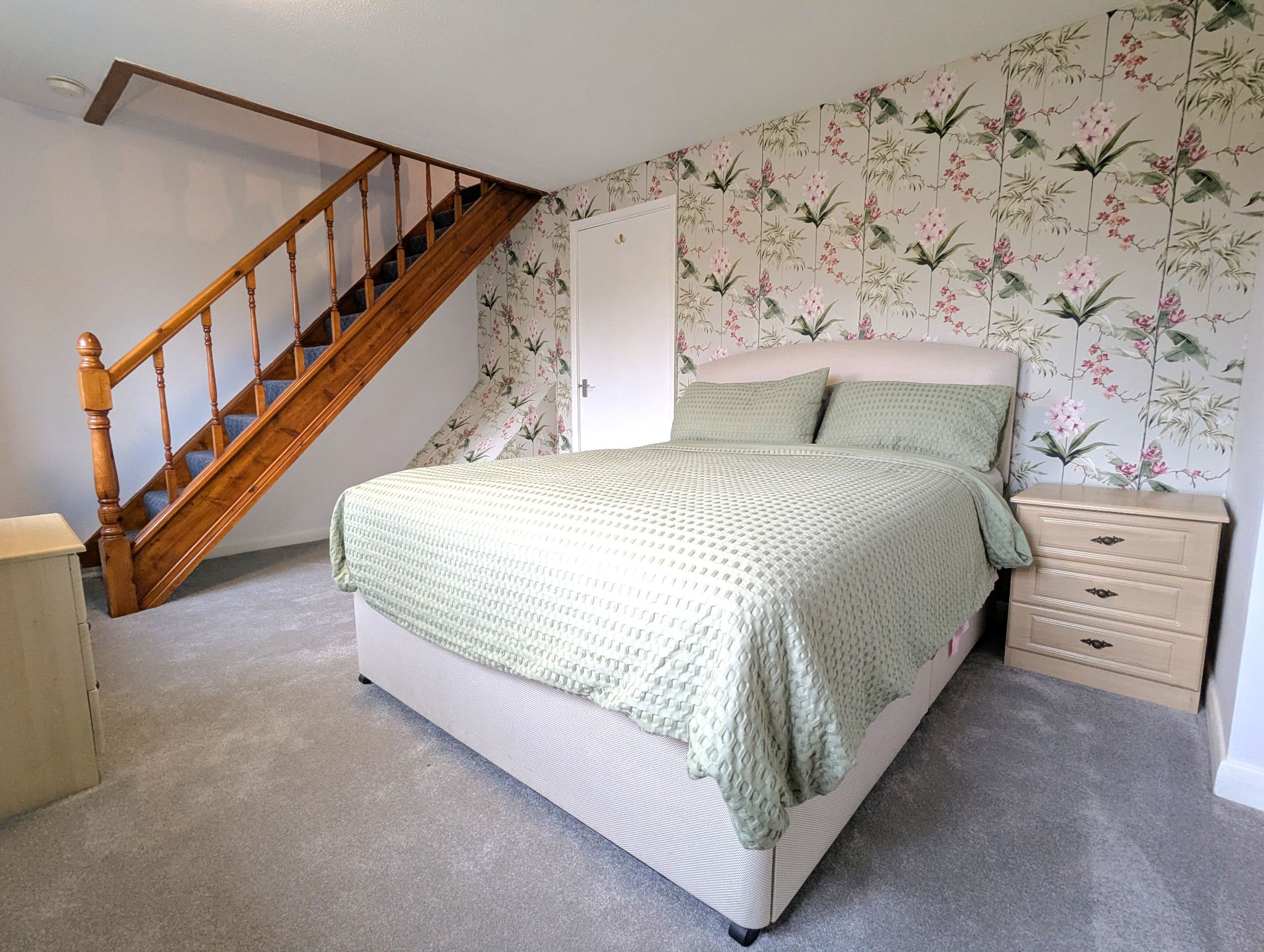 Bedroom One - 9'9 x 14'3 (3.02m x 4.36m) - Carpeted bedroom with 2 front-facing double glazed windows, carpeted permanent staircase to the converted loft room, 2 wall mounted radiators.