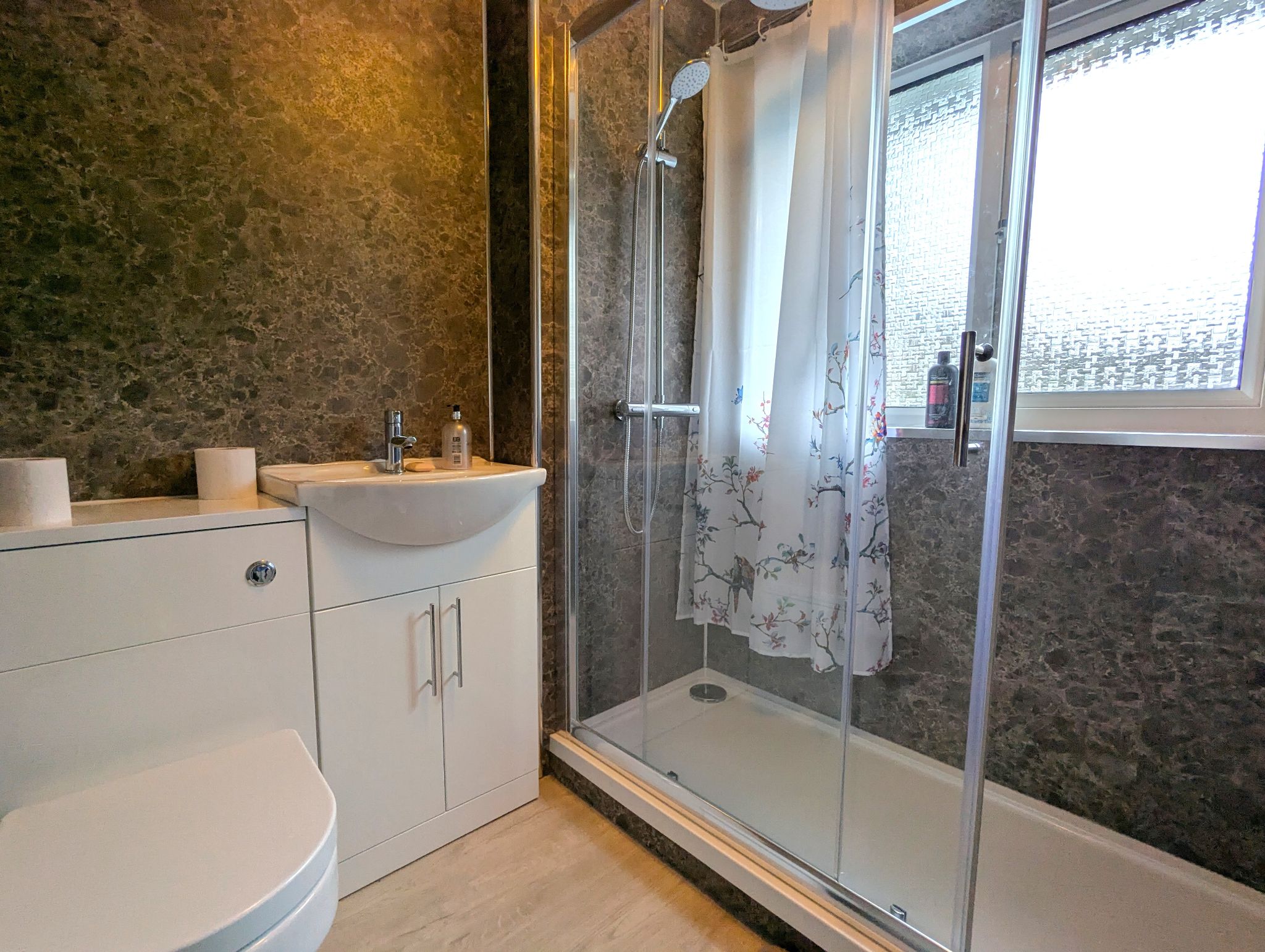 Bathroom - 5'6 x 5'8 (1.72m x 1.78m) - Modernised bathroom laminate flooring and full-height tiled splashback to all sides, matching 3 piece bath suite with electric shower over the bath, rear-facing double glazed window, wall mounted radiator.